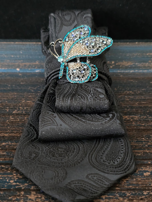 Black Paisley Tie Necklace: Rhinestone Butterfly Brooch, Women's Neckwear
