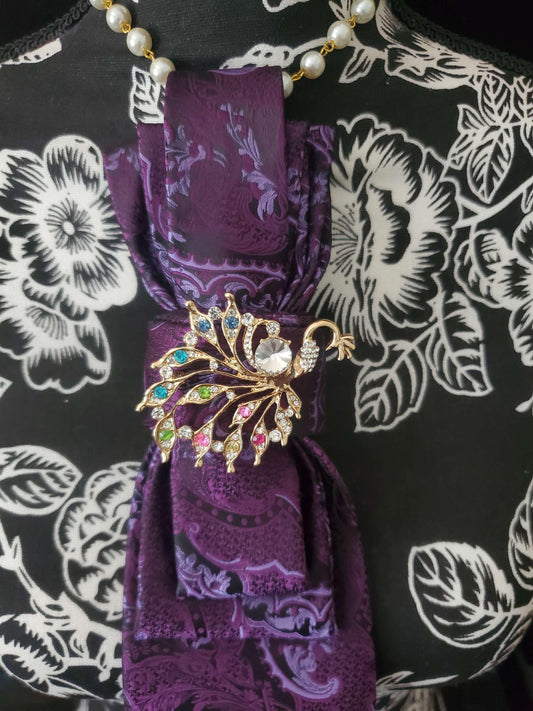 Handcrafted Purple Paisley Necktie Necklace: Rhinestone Peacock Brooch