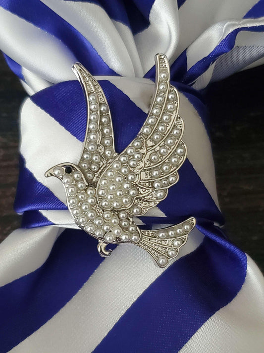 Handmade Royal Blue Stripe Necktie Necklace: Pearl Dove Brooch