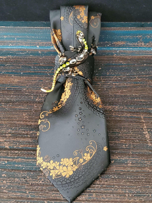 Handcrafted Black & Gold Necktie Necklace: Rhinestone Lizard Brooch
