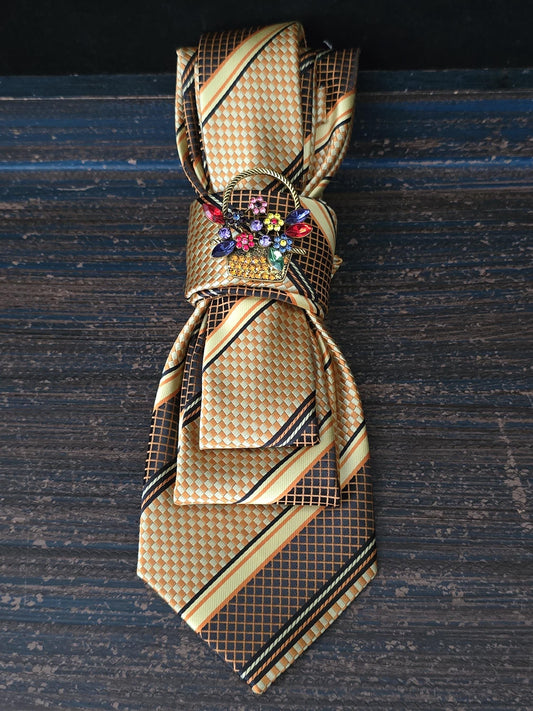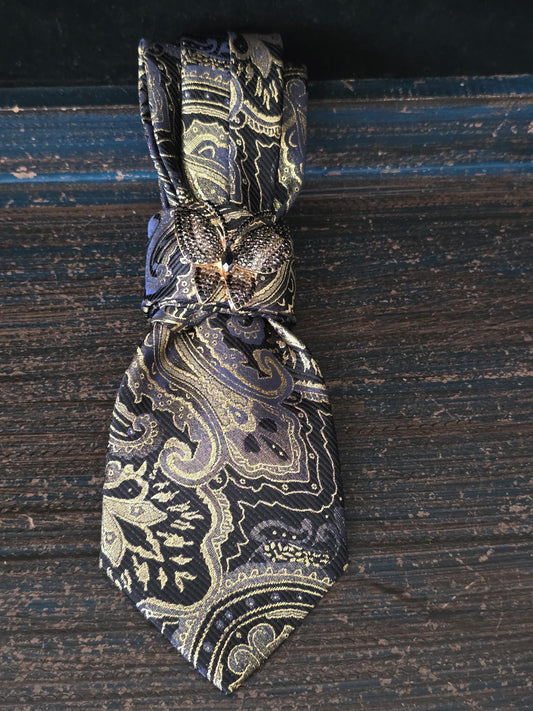 Handcrafted Paisley Necktie Necklace: Black & Gold Butterfly Brooch