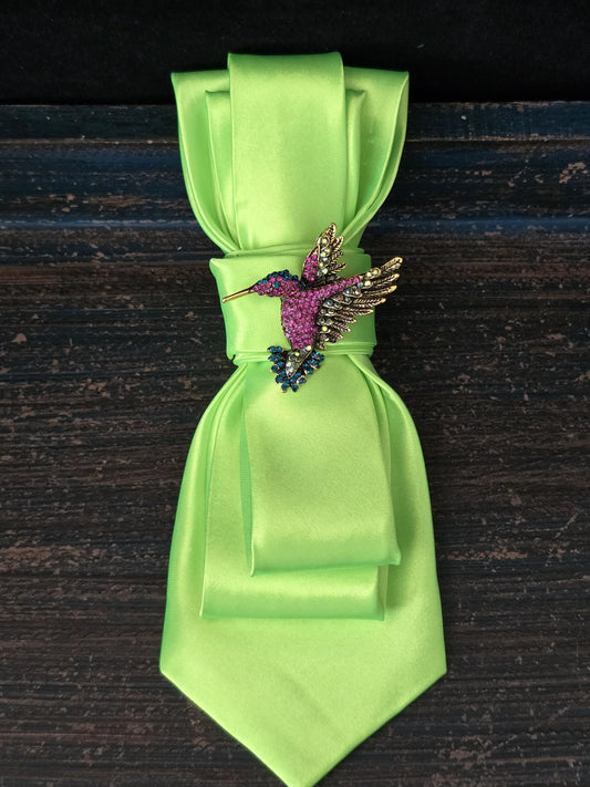 Lime Green Tie Necklace: Rhinestone Hummingbird Brooch, Handcrafted Neckwear