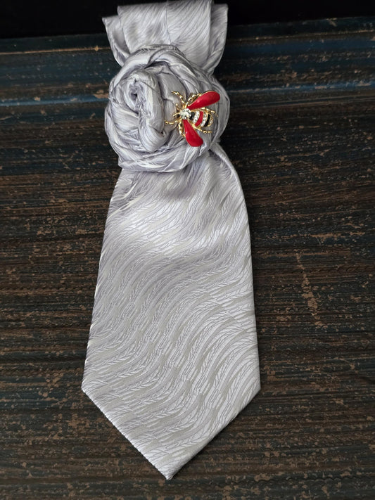 Gray Silk Necktie Necklace: Bumble Bee Brooch, Handmade Statement Jewelry