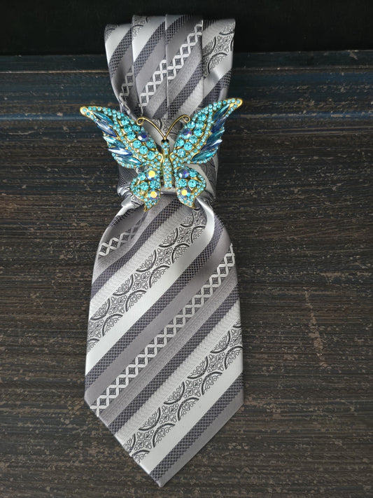 Gray Stripe Necktie Necklace: Gray Silk, Rhinestone Butterfly Brooch