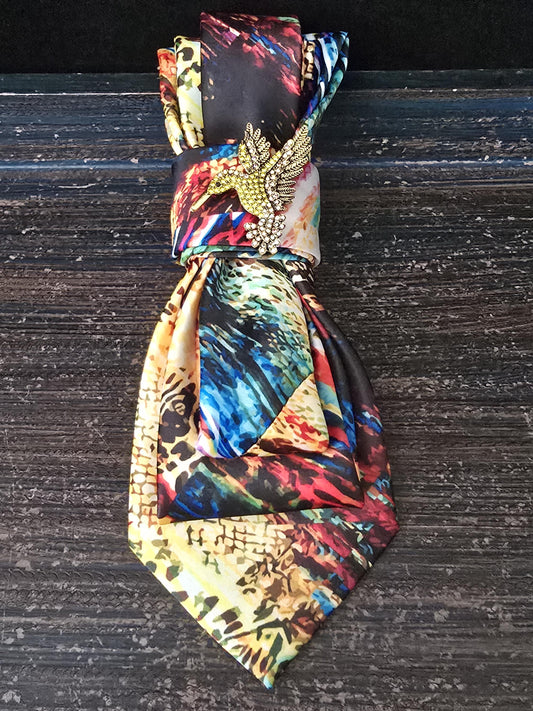 Handmade Silk Tie Necklace: Rhinestone Hummingbird Brooch - Multi-Color Neckwear