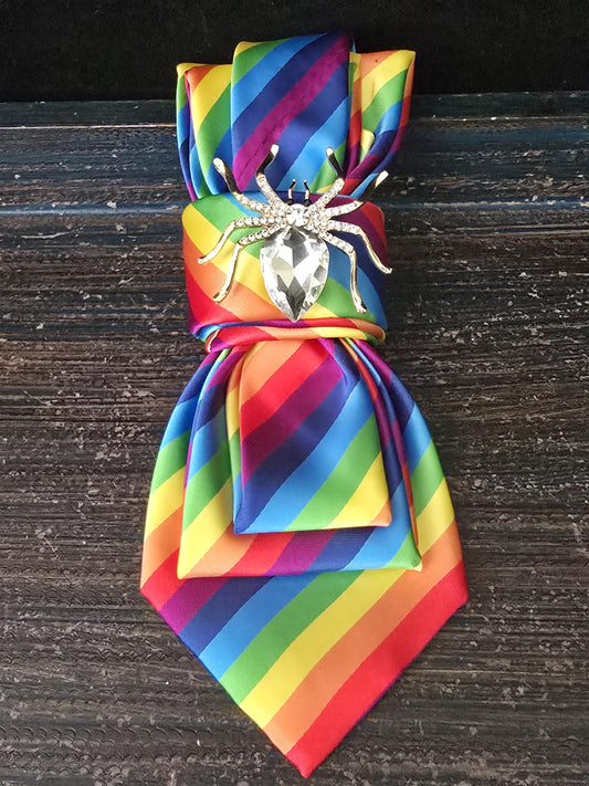 Rainbow Silk Tie Necklace: Spider Brooch, Pearl Accent