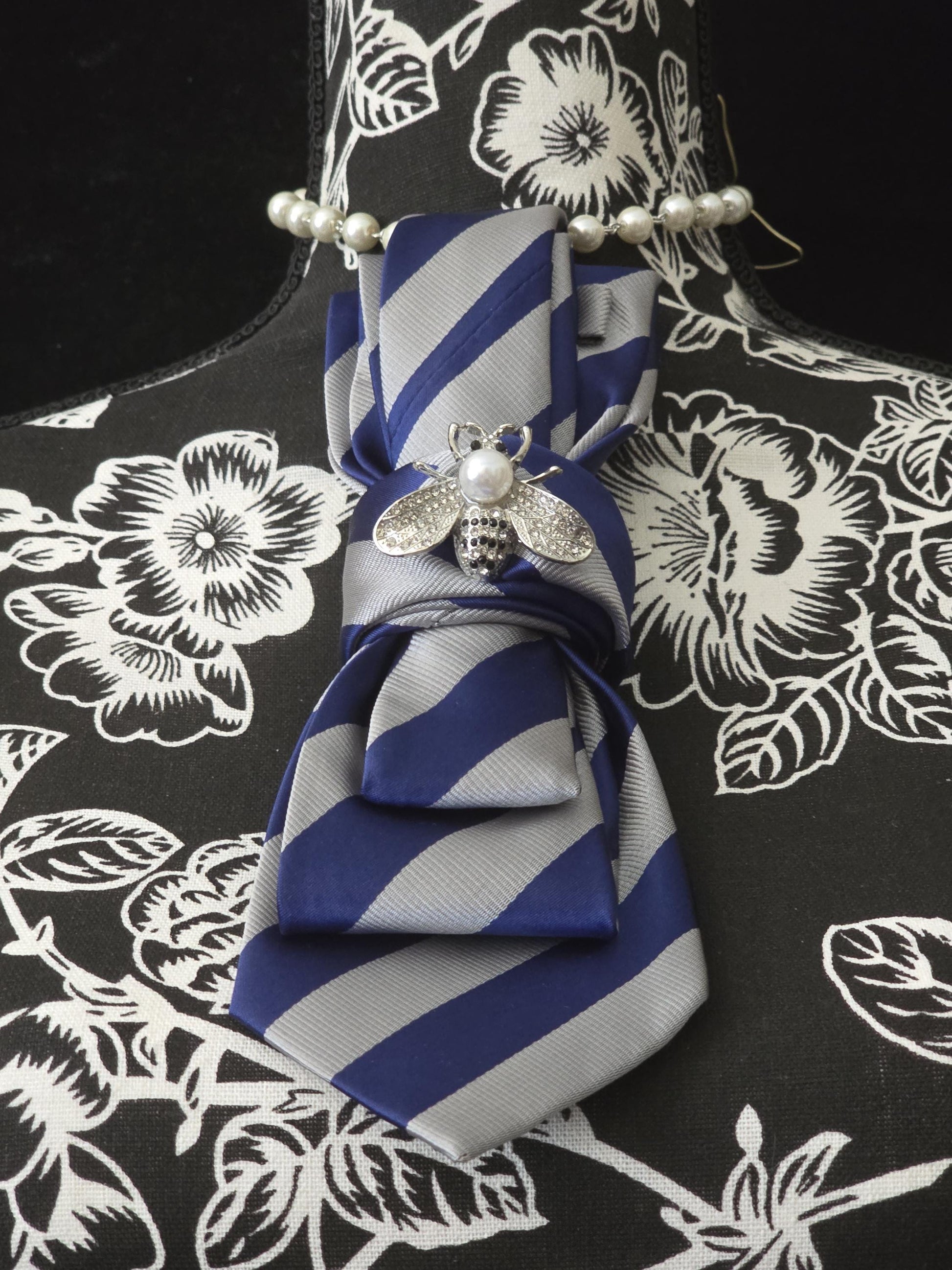 Blue Gray Stripe Silk Necktie Necklace: Rhinestone Bee Brooch