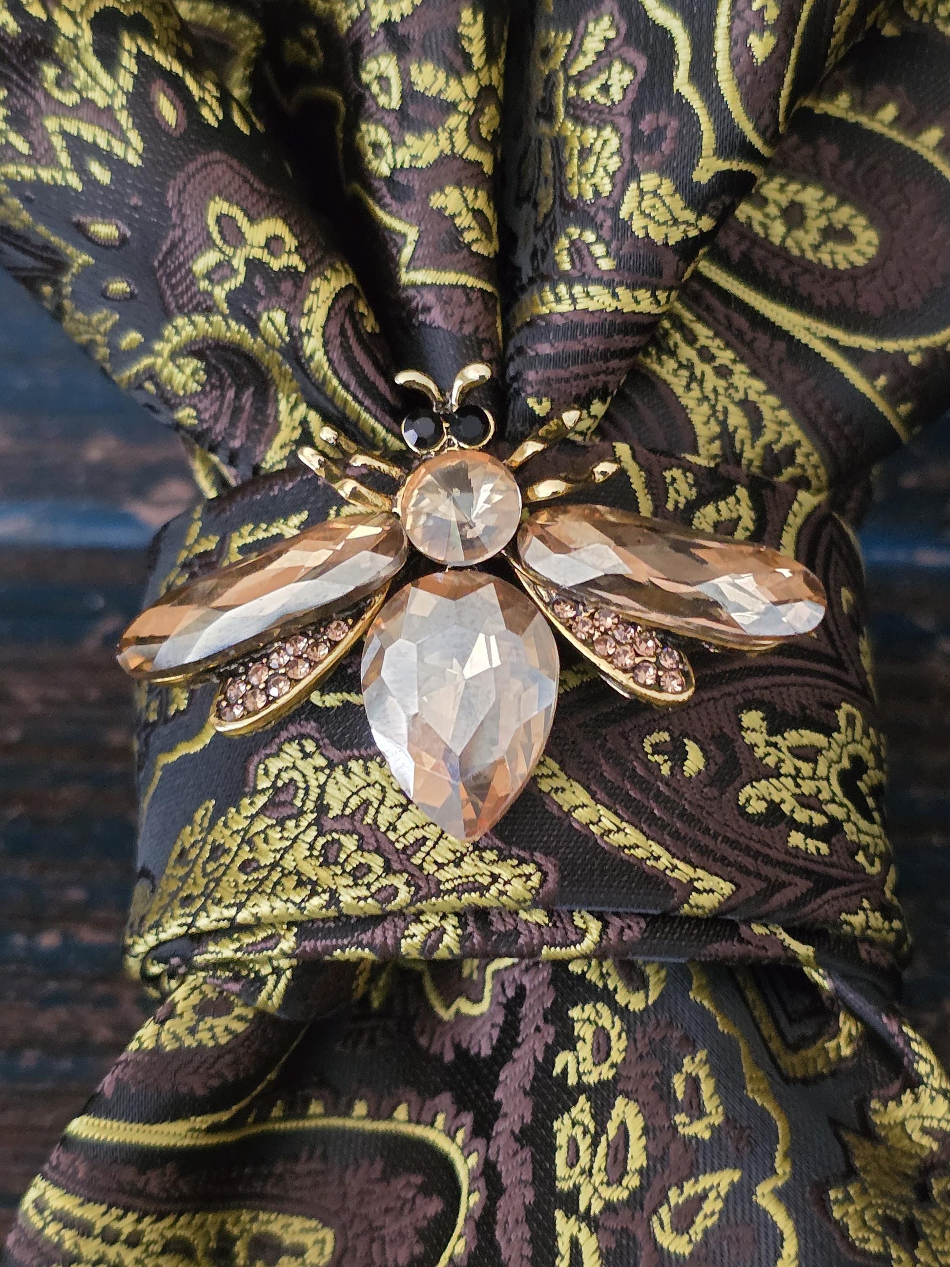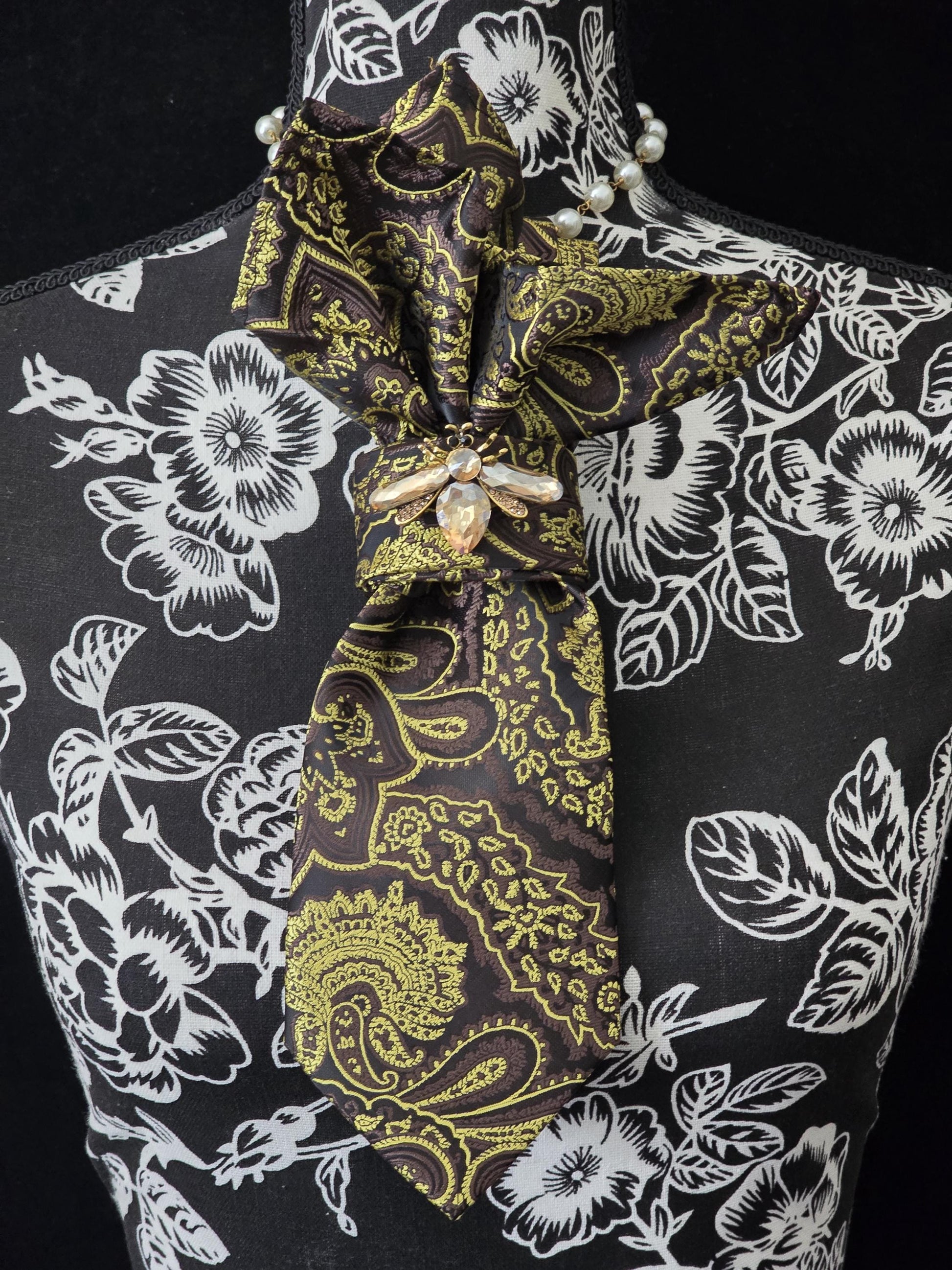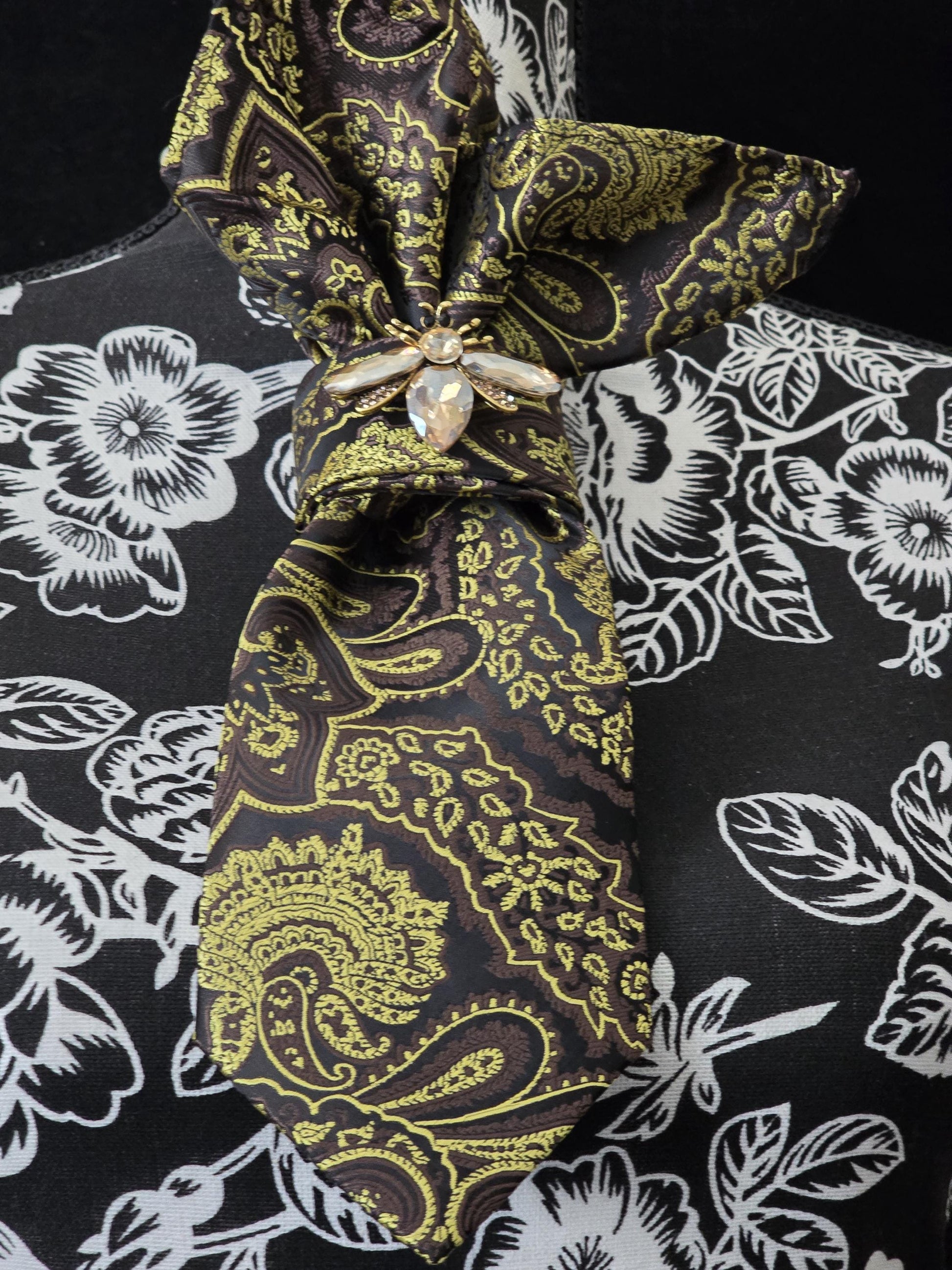 This Bold but Classy Brown Plaid Necktie Necklace is made with a woven silk tie, and features a Gold Crystal Brooch strung on your choice of an adjustable Rosary Chain Ribbon Tie Pearl Necklace or an adjustable Elastic Band. The soft, comfortable fabric sits perfectly on any size chest, while the adjustable necklace feature allows you to customize the fit to your liking. Measuring at a versatile length, this necktie necklace is designed to be a one-size-fits-all.