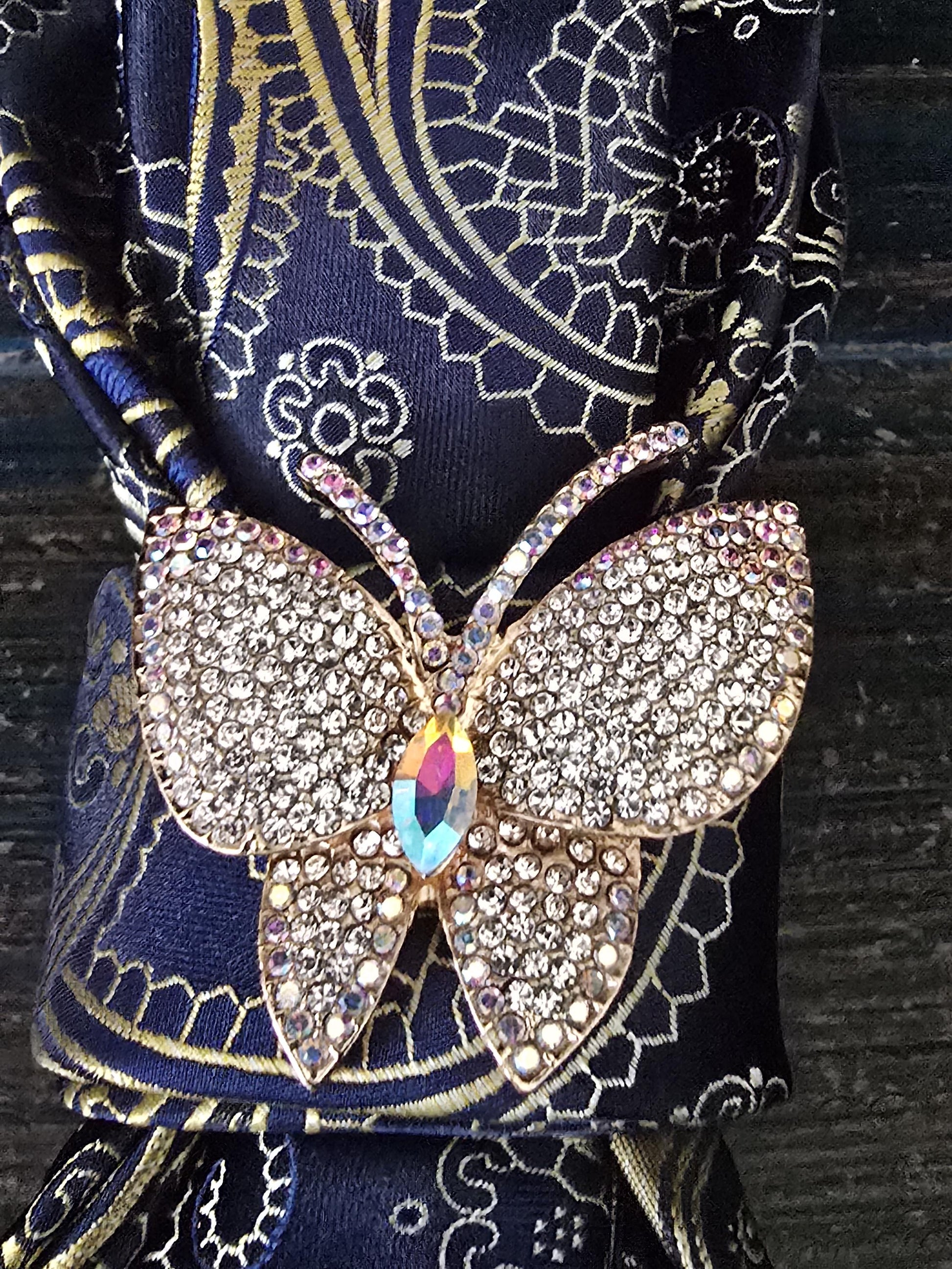 This Simple but Elegant Blue and Gold Paisley Necktie Necklace is made with a (Barry Wang) woven silk tie, and features a Gold Rhinestone Butterfly Brooch strung on your choice of an adjustable Rosary Chain Ribbon Tie Pearl Necklace or an adjustable Elastic Band. The soft, comfortable fabric sits perfectly on any size chest, while the adjustable necklace feature allows you to customize the fit to your liking. Measuring at a versatile length, this necktie necklace is designed to be a one-size-fits-all.