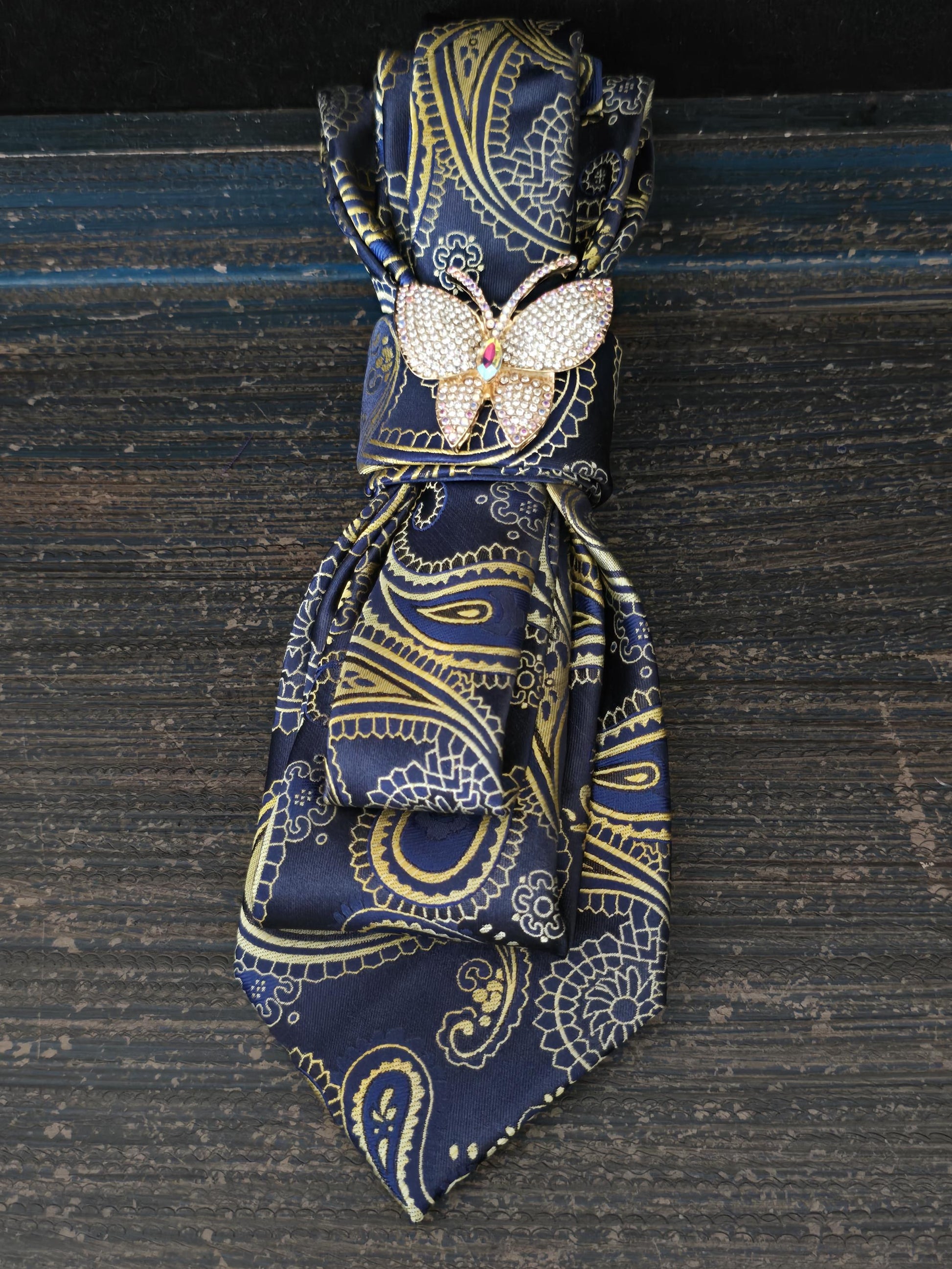 Butterfly Brooch Necklace - Blue and Gold Paisley Women's Tie-Handcrafted Statement Jewelry - Brooch Necktie - Stylish Neckwear For Women