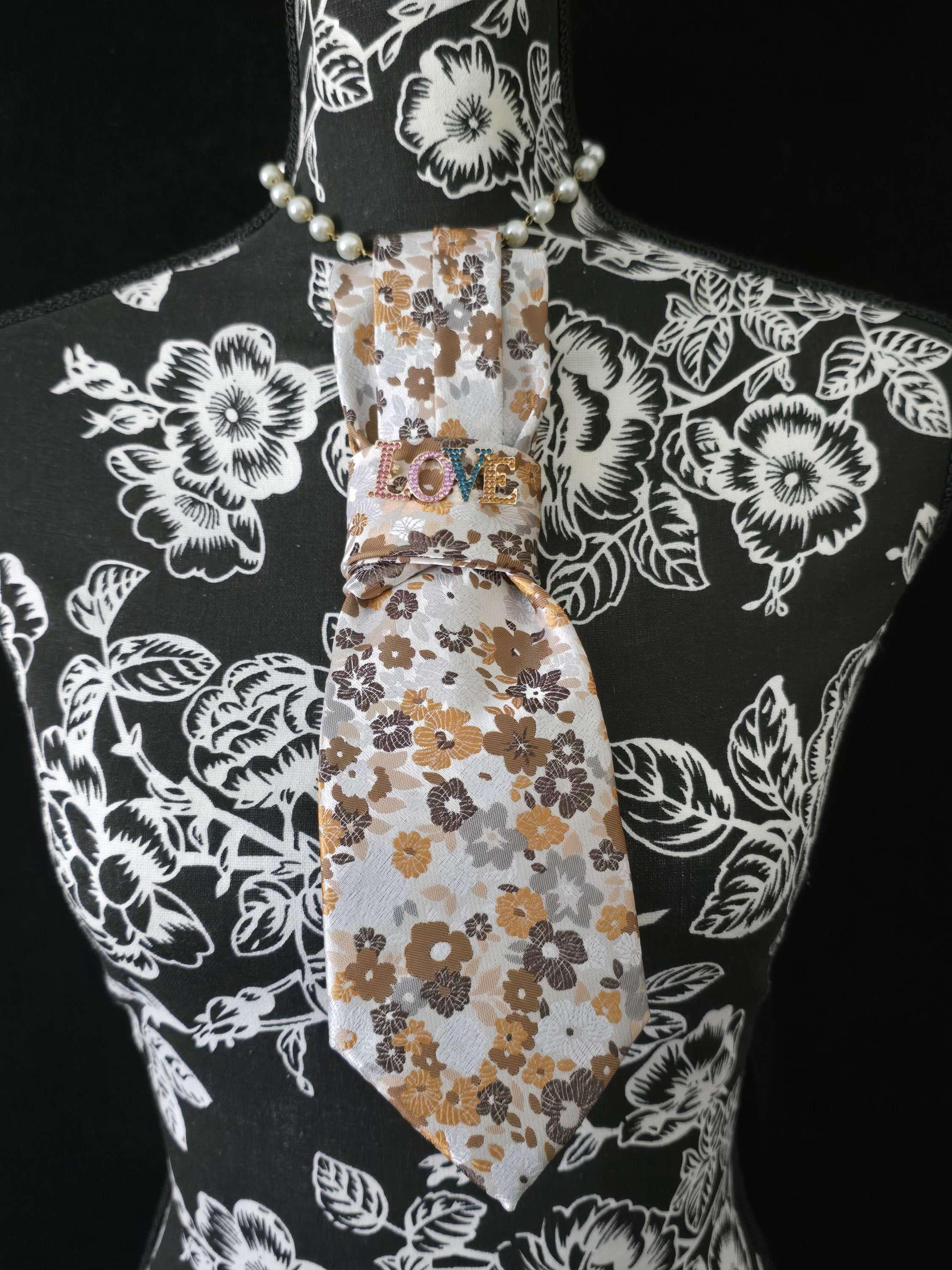 Floral Silk Necktie Necklace: Rhinestone LOVE Brooch, Pearl Chain