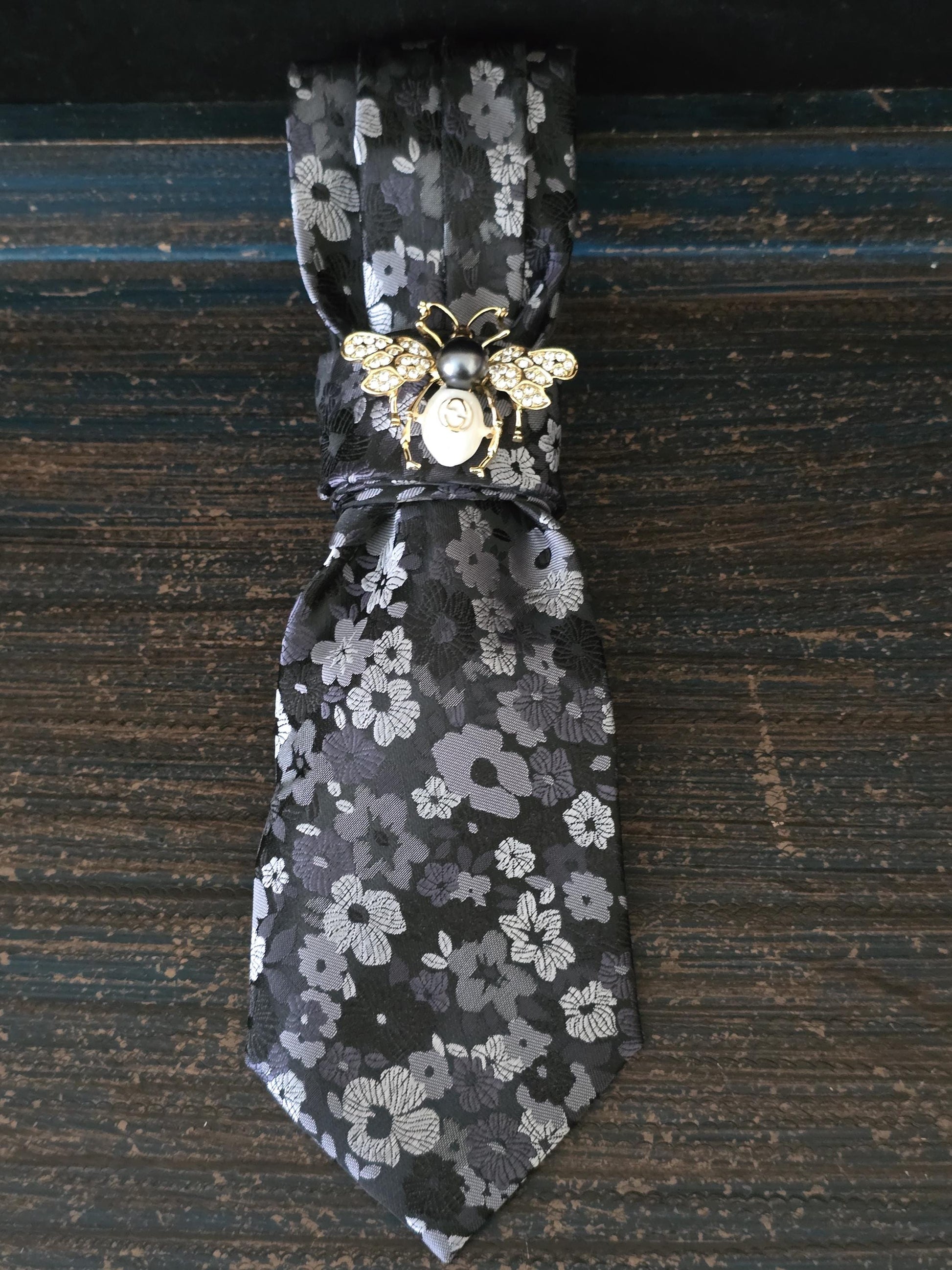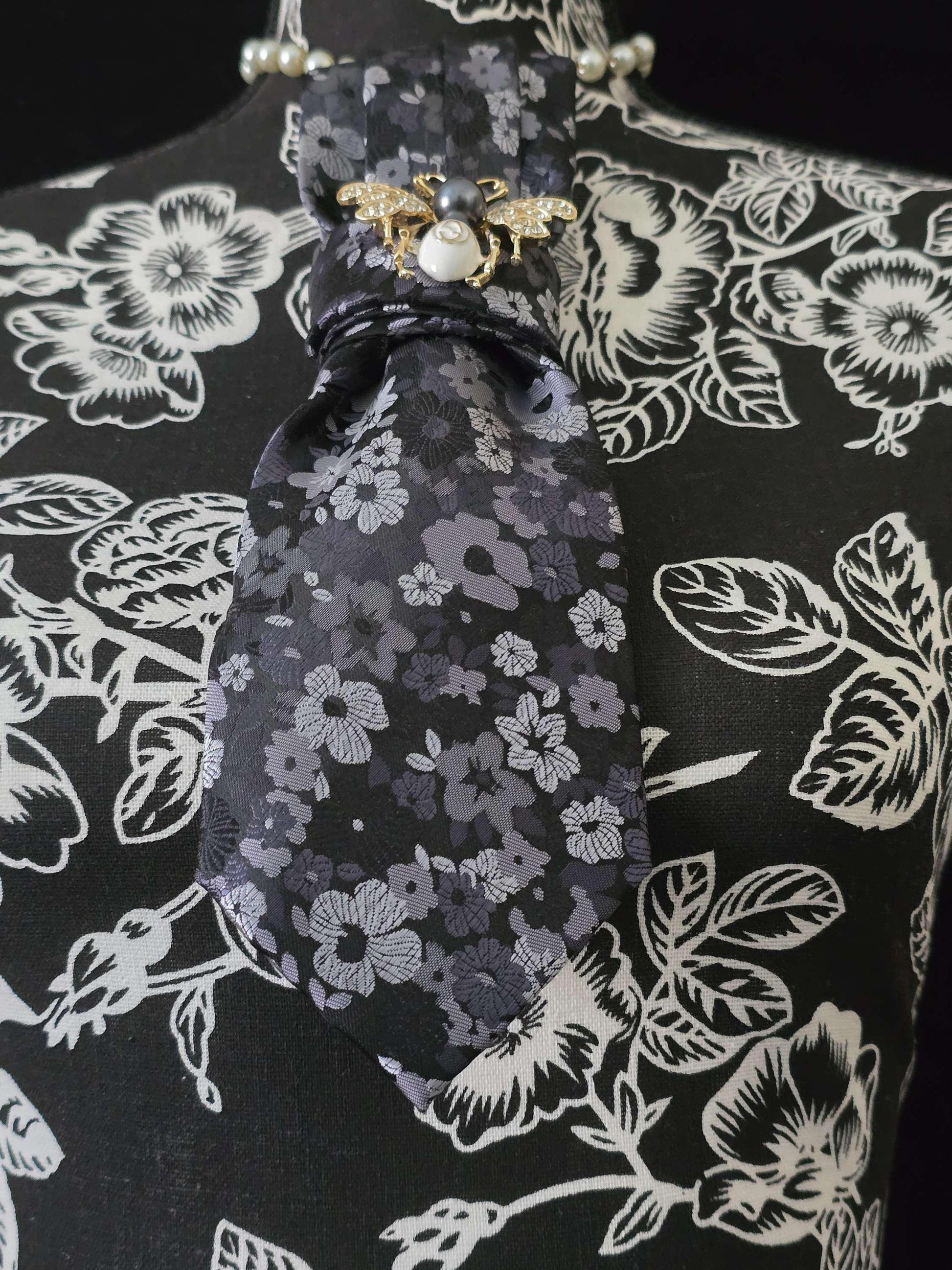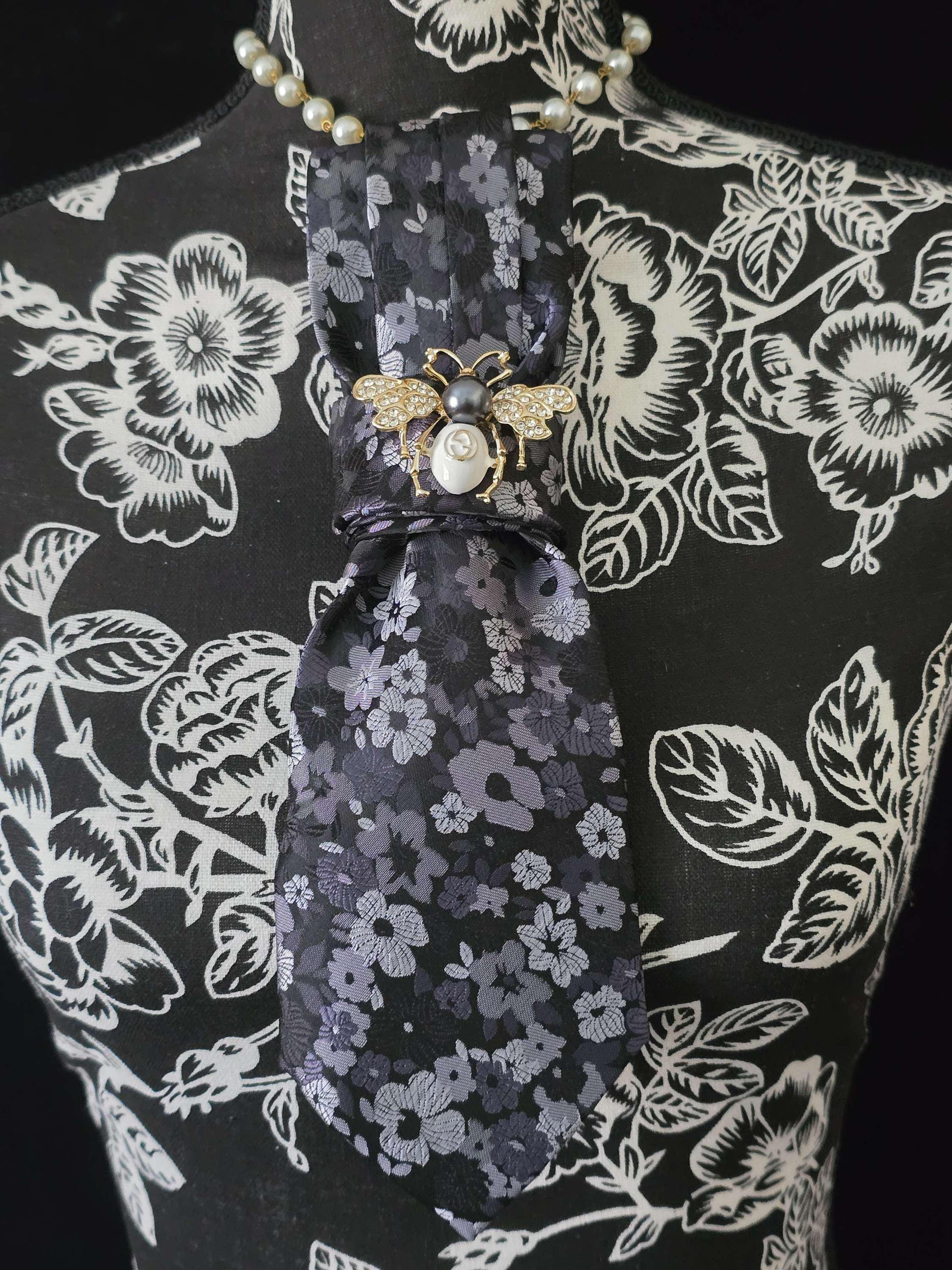 Floral Silk Tie Necklace: Handmade Women's Neckwear with Bumble Bee Brooch