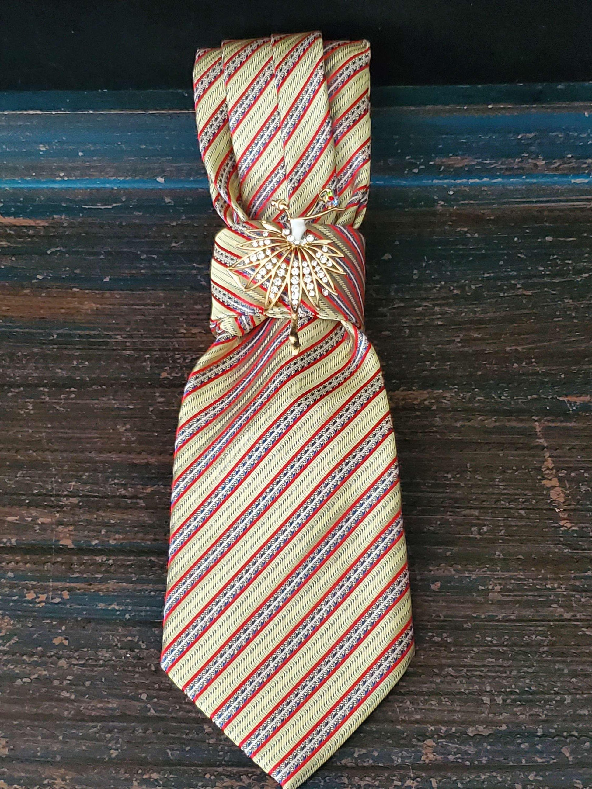 Gold Striped Necktie Necklace: Handmade Silk Tie with Ballerina Brooch
