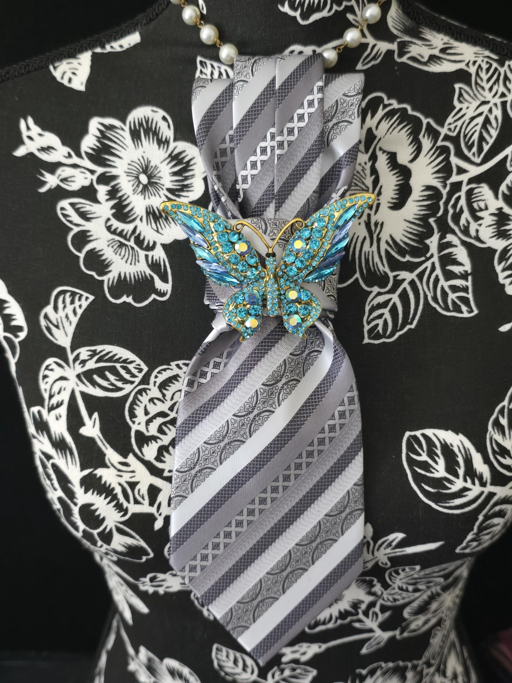 Gray Stripe Necktie Necklace: Gray Silk, Rhinestone Butterfly Brooch