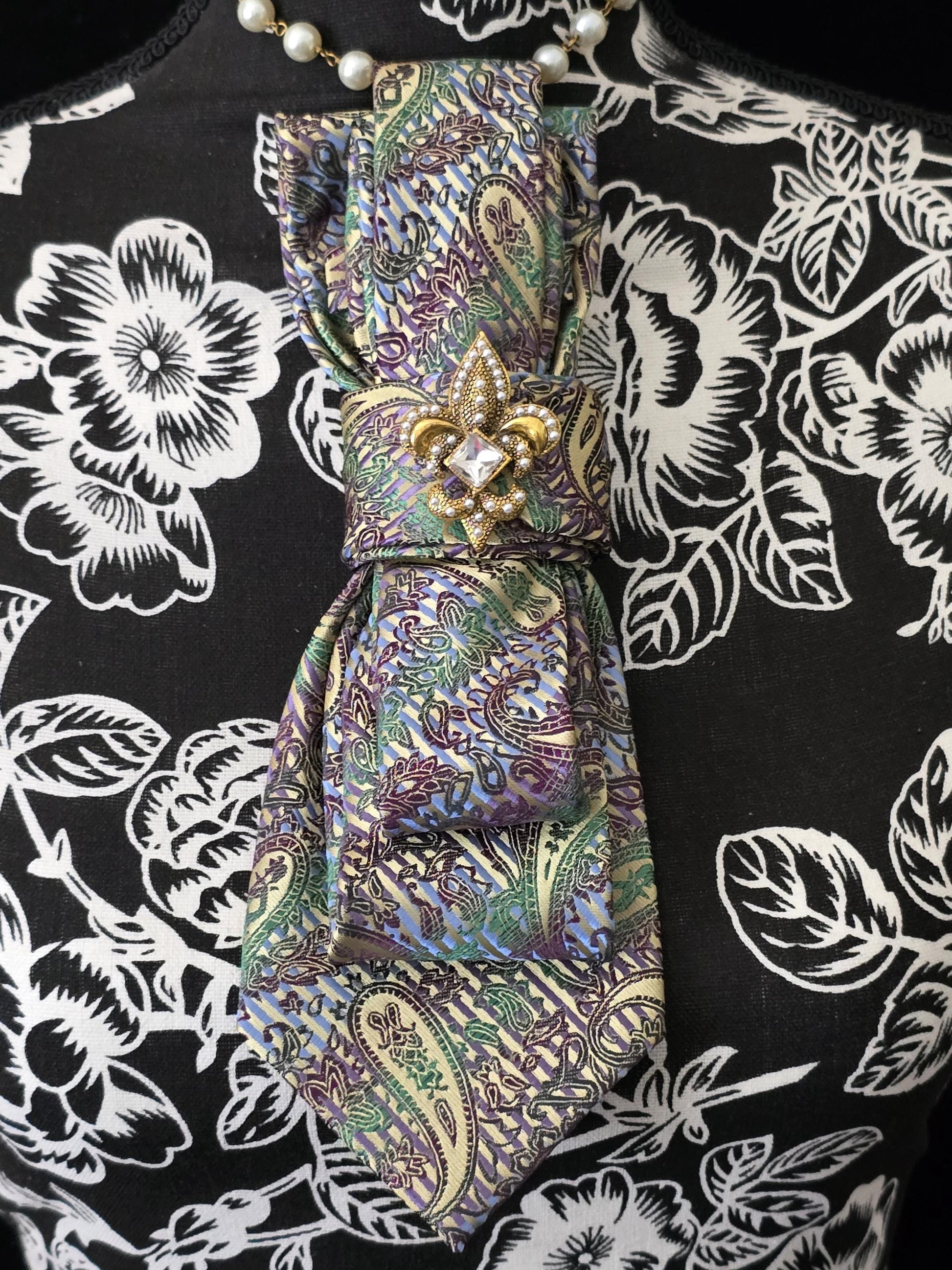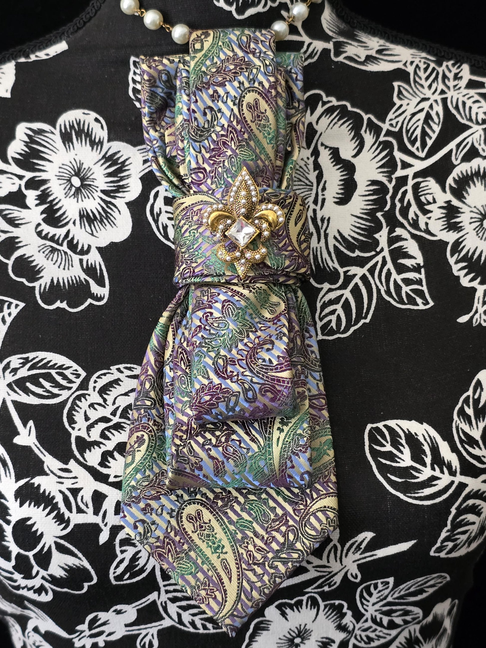 Paisley Silk Necktie Necklace: Fleur-de-lis Brooch, Adjustable Chain