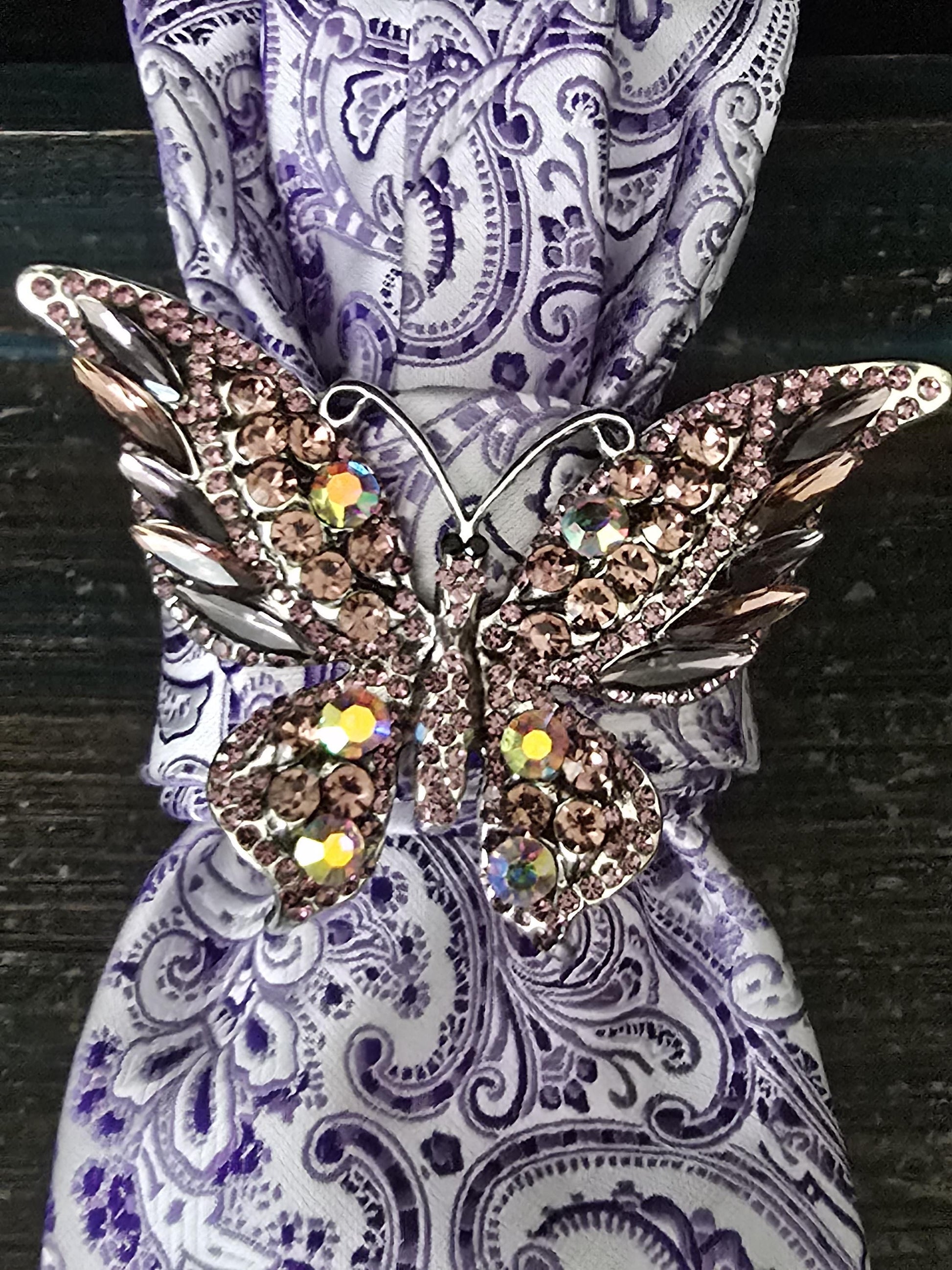 Purple Paisley Necktie Necklace: Purple Silk, Rhinestone Butterfly Brooch