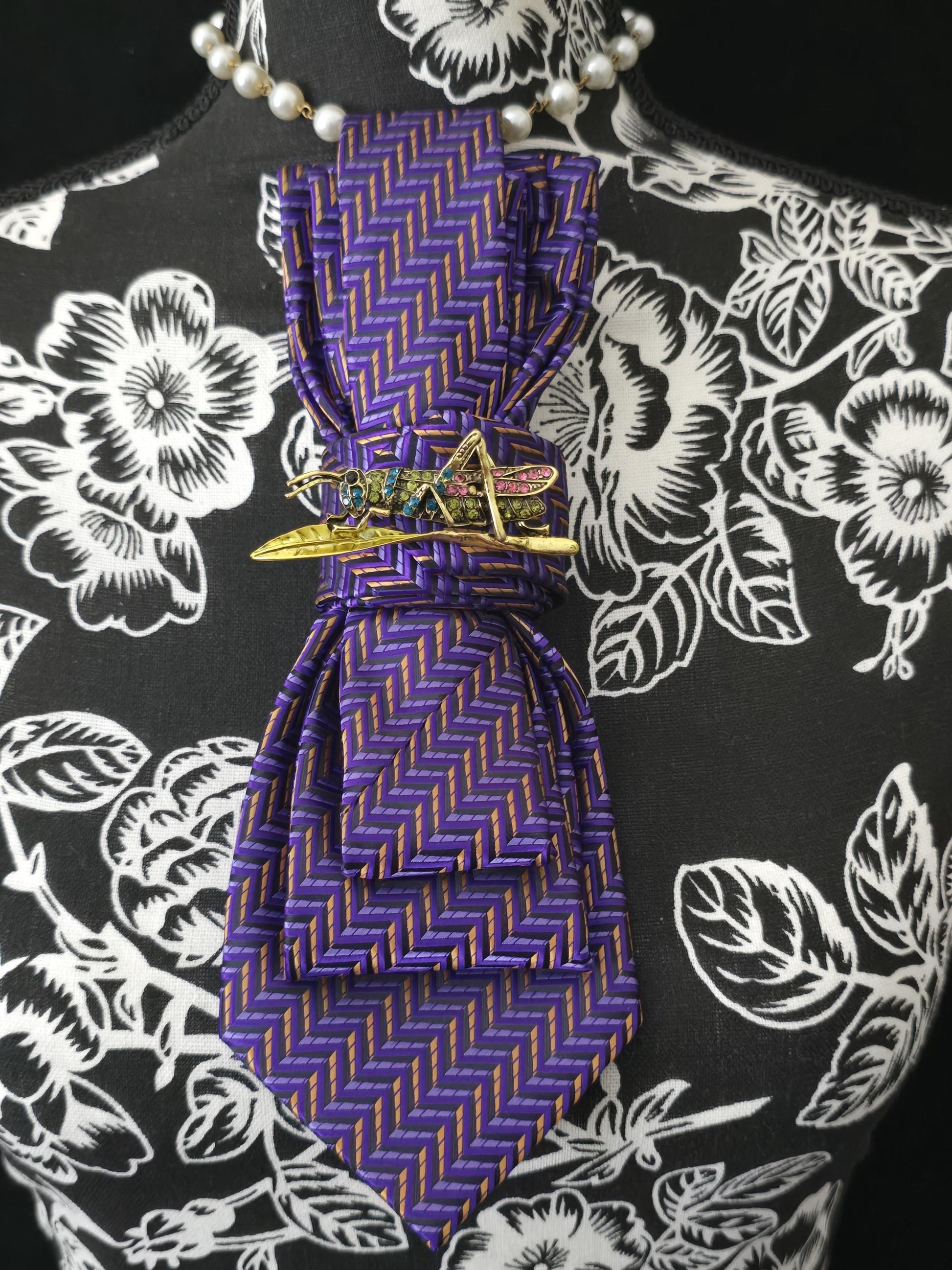 Purple Women's Tie- Grasshopper Brooch Necklace - Handcrafted Statement Jewelry - Brooch Necktie - Stylish Neckwear For Women