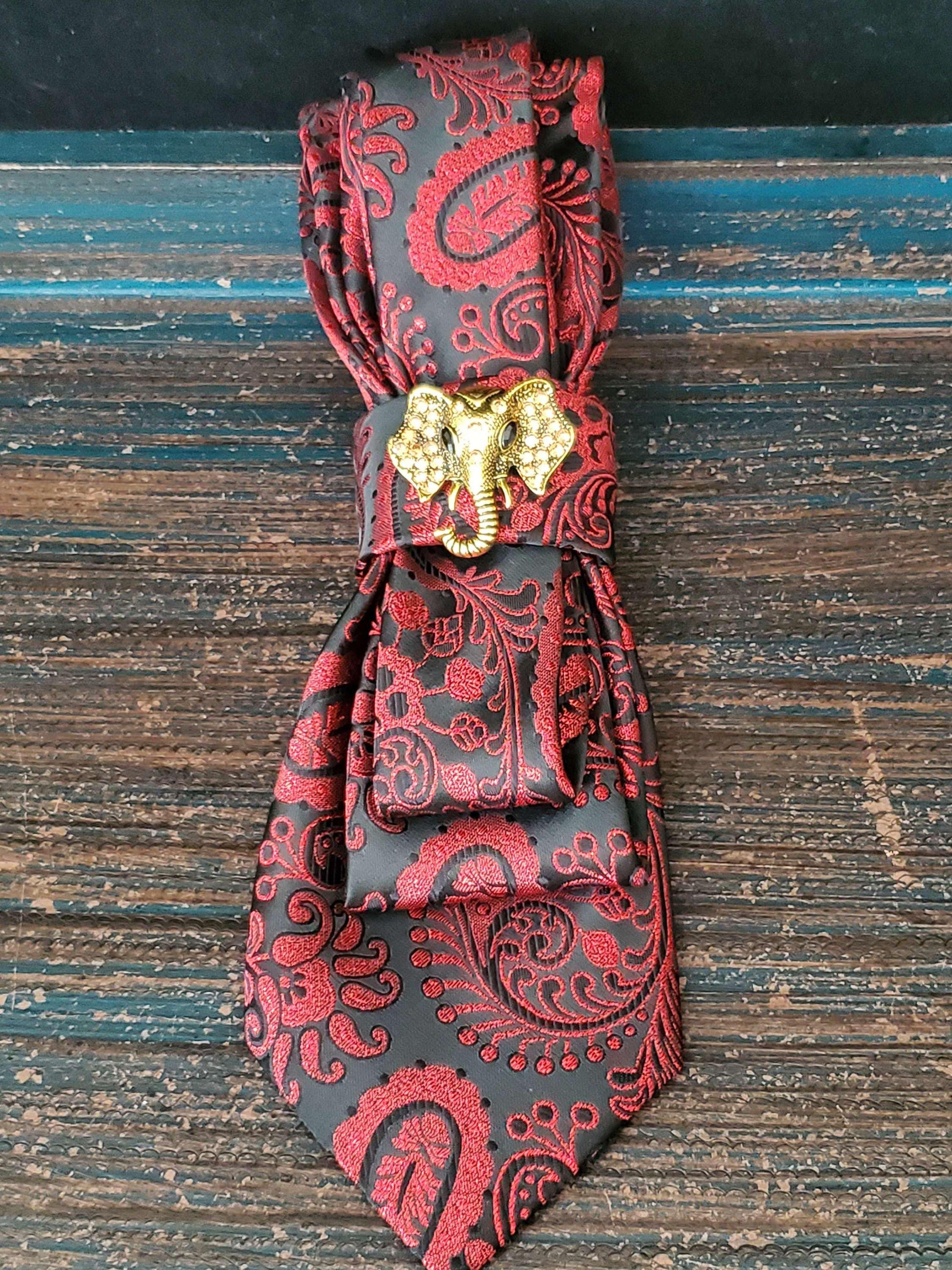 Red Paisley Tie Necklace: Elephant Brooch, Handcrafted Statement Jewelry
