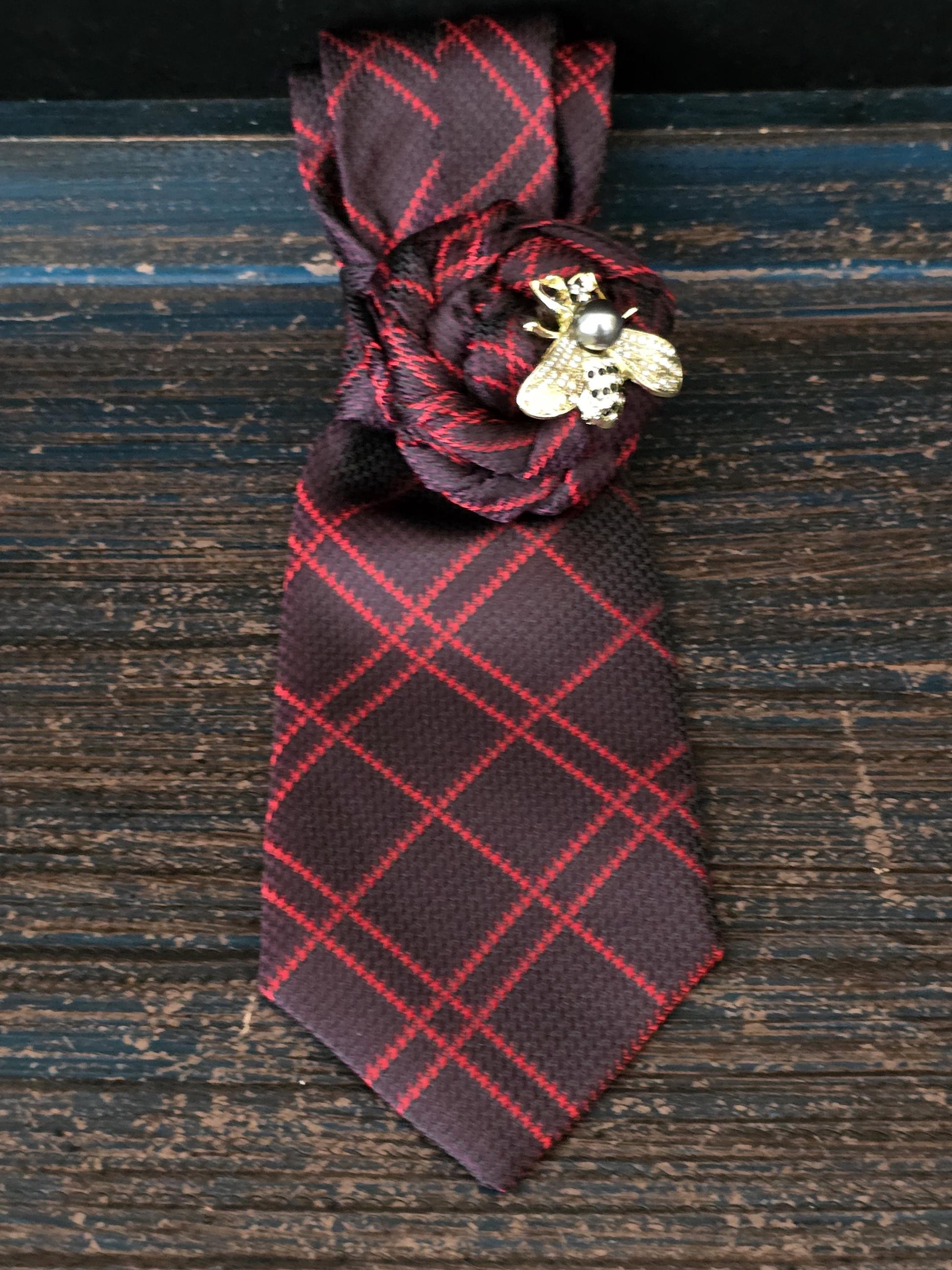 Red Plaid Necktie Necklace: Bumble Bee Brooch, Handmade Statement Jewelry