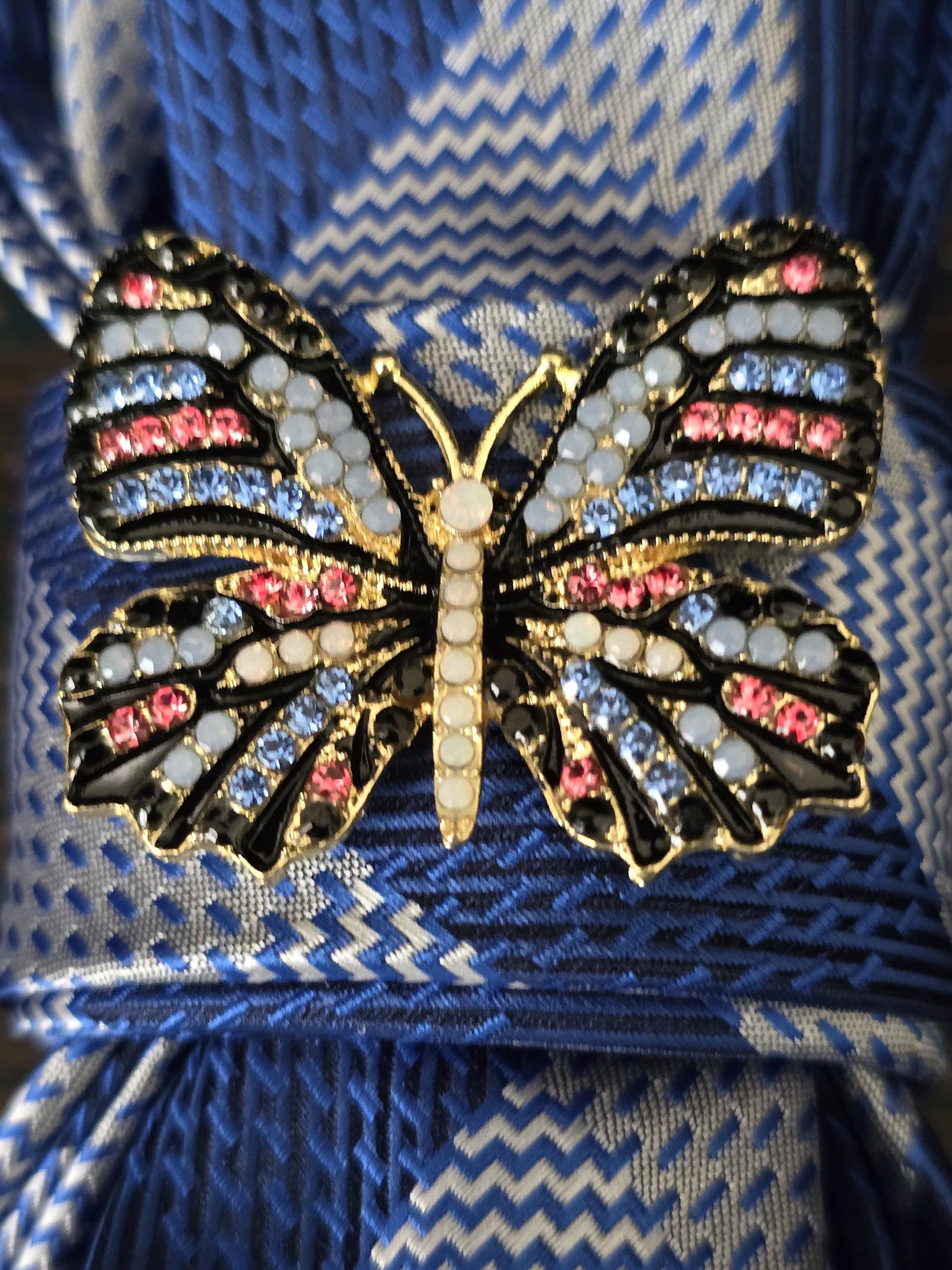 This Stylish Blue Stripe Necktie Necklace is made with a woven silk tie, and features a Gold Rhinestone Butterfly Brooch strung on your choice of an adjustable Rosary Chain Ribbon Tie Pearl Necklace or an adjustable Elastic Band. The soft, comfortable fabric sits perfectly on any size chest, while the adjustable necklace feature allows you to customize the fit to your liking. Measuring at a versatile length, this necktie necklace is designed to be a one-size-fits-all.