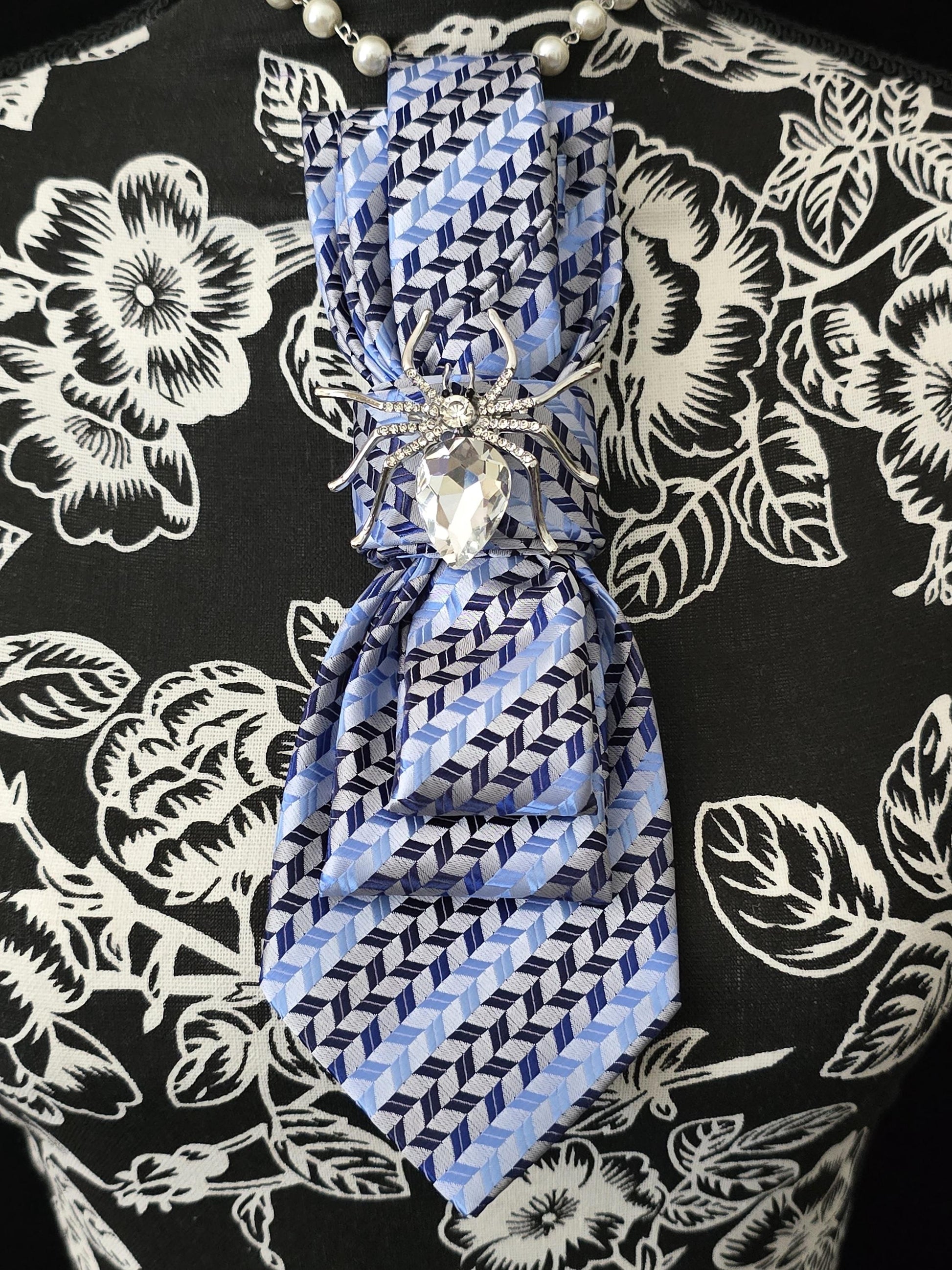 This Stylish Blue Stripe Necktie Necklace is made with a woven silk tie, and features a Silver Crystal Spider Brooch strung on your choice of an adjustable Rosary Chain Ribbon Tie Pearl Necklace or an adjustable Elastic Band. The soft, comfortable fabric sits perfectly on any size chest, while the adjustable necklace feature allows you to customize the fit to your liking. Measuring at a versatile length, this necktie necklace is designed to be a one-size-fits-all.