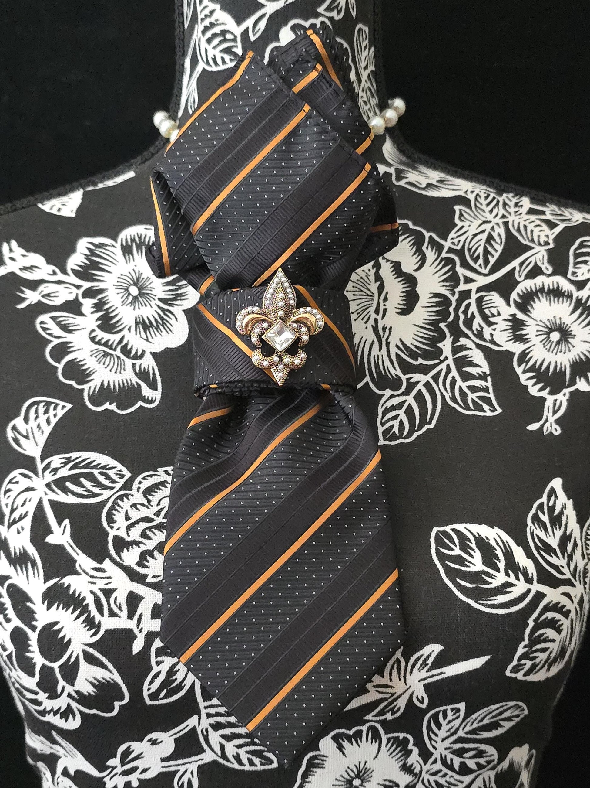 Simply Elegant Black and Gold Stripe Women's Necktie Necklace - Handcrafted Statement Jewelry - Brooch Necktie - Stylish Neckwear For Women