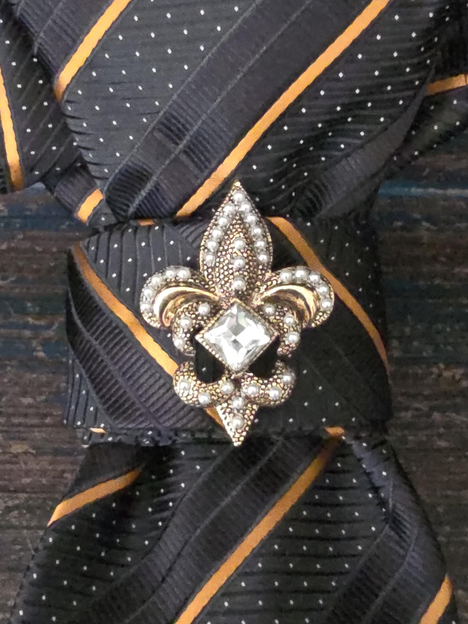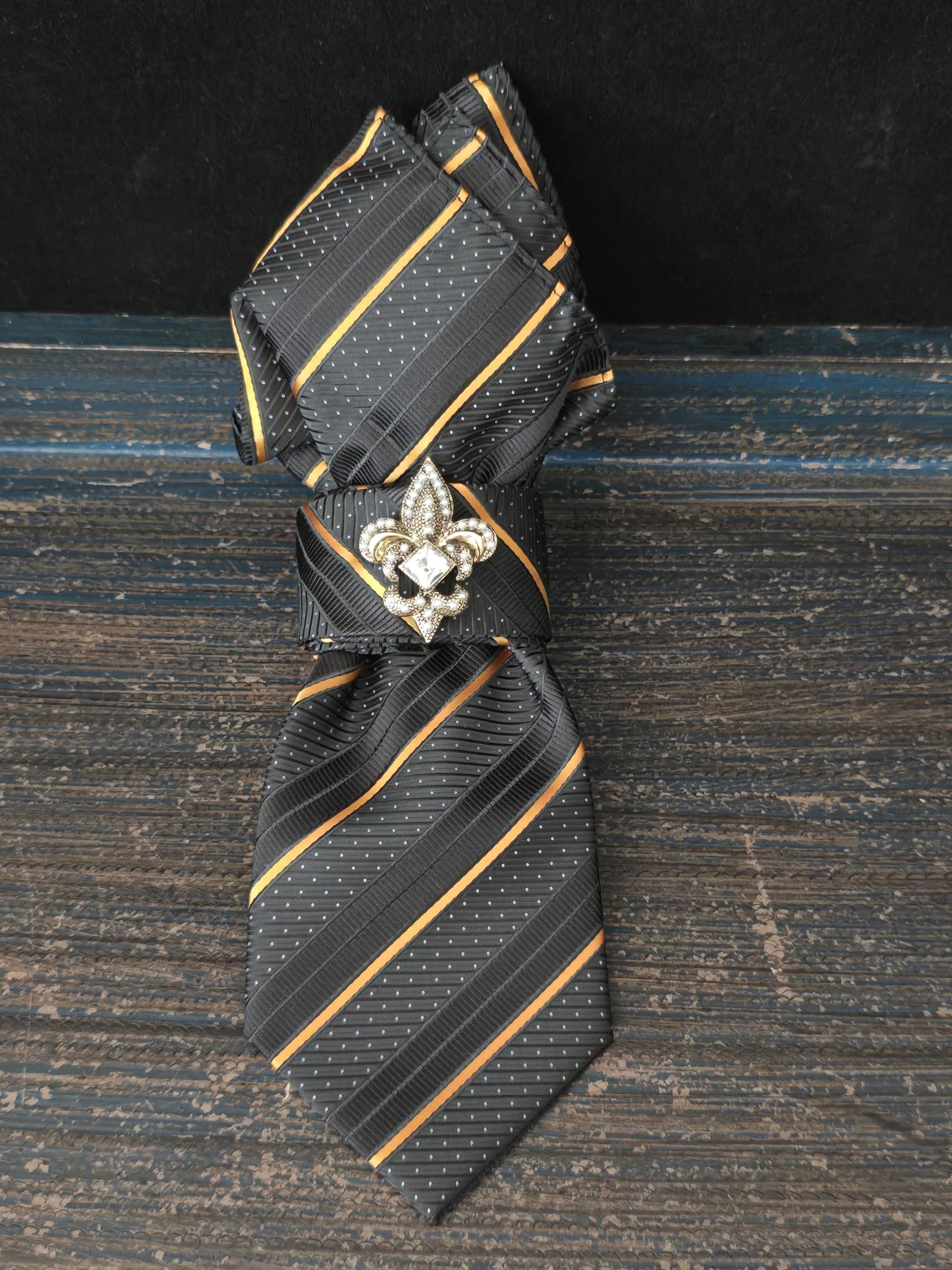 This Black and Gold Stripe Necktie Necklace is made with a woven silk tie, and features a Pearl and Gold Fleur-de-lis Brooch strung on your choice of an adjustable Rosary Chain Ribbon Tie Pearl Necklace or an adjustable Elastic Band. The soft, comfortable fabric sits perfectly on any size chest, while the adjustable necklace feature allows you to customize the fit to your liking. Measuring at a versatile length, this necktie necklace is designed to be a one-size-fits-all.