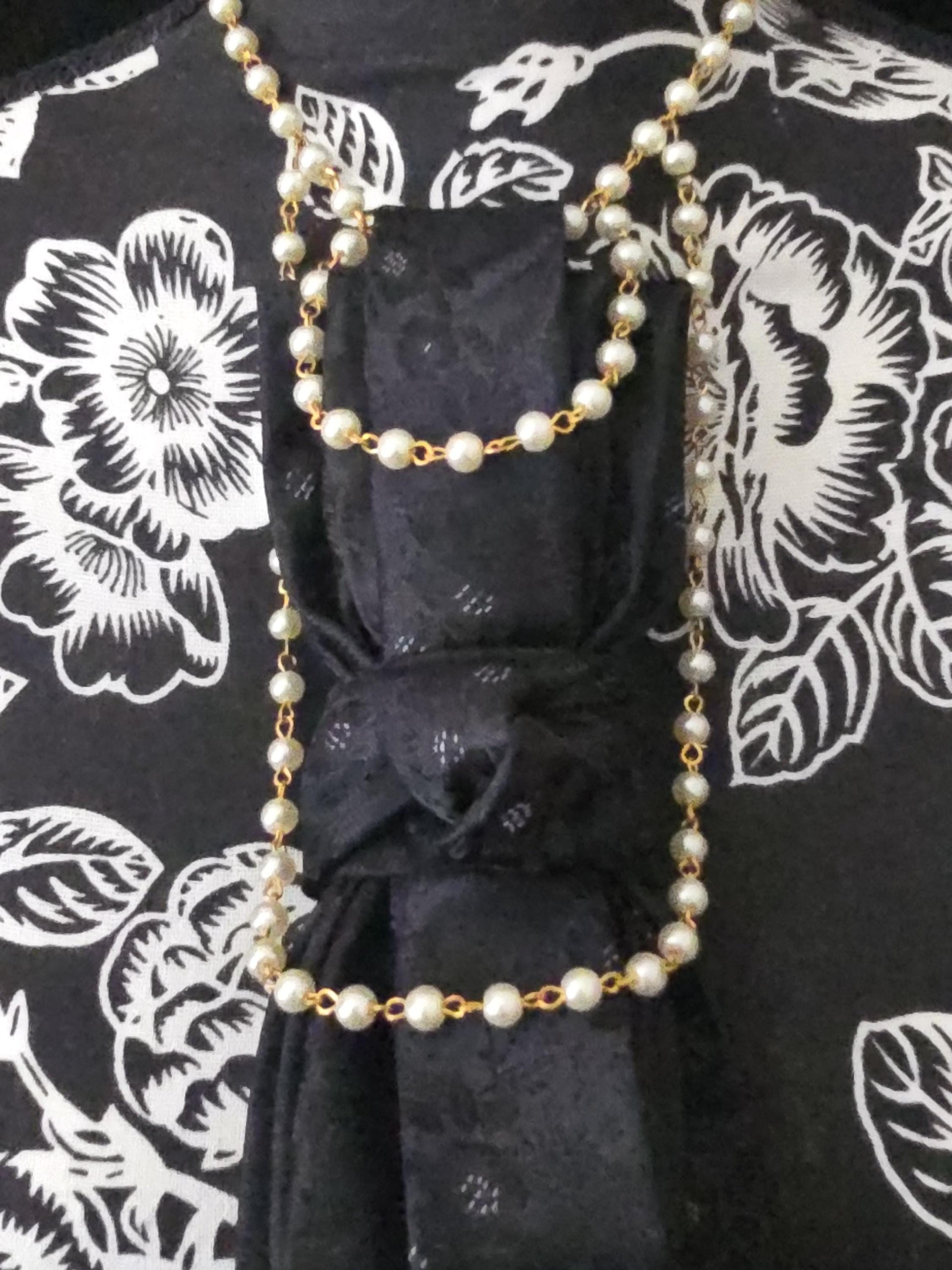 This Black Floral Necktie Necklace is made with a (Barry Wang) woven silk tie, and features a Tie Knot Brooch strung on Multi-Strand 6mm adjustable Rosary Chain Ribbon Tie Pearl Necklace . The soft, comfortable fabric sits perfectly on any size chest, while the adjustable necklace feature allows you to customize the fit to your liking. Measuring at a versatile length, this necktie necklace is designed to be a one-size-fits-all.
