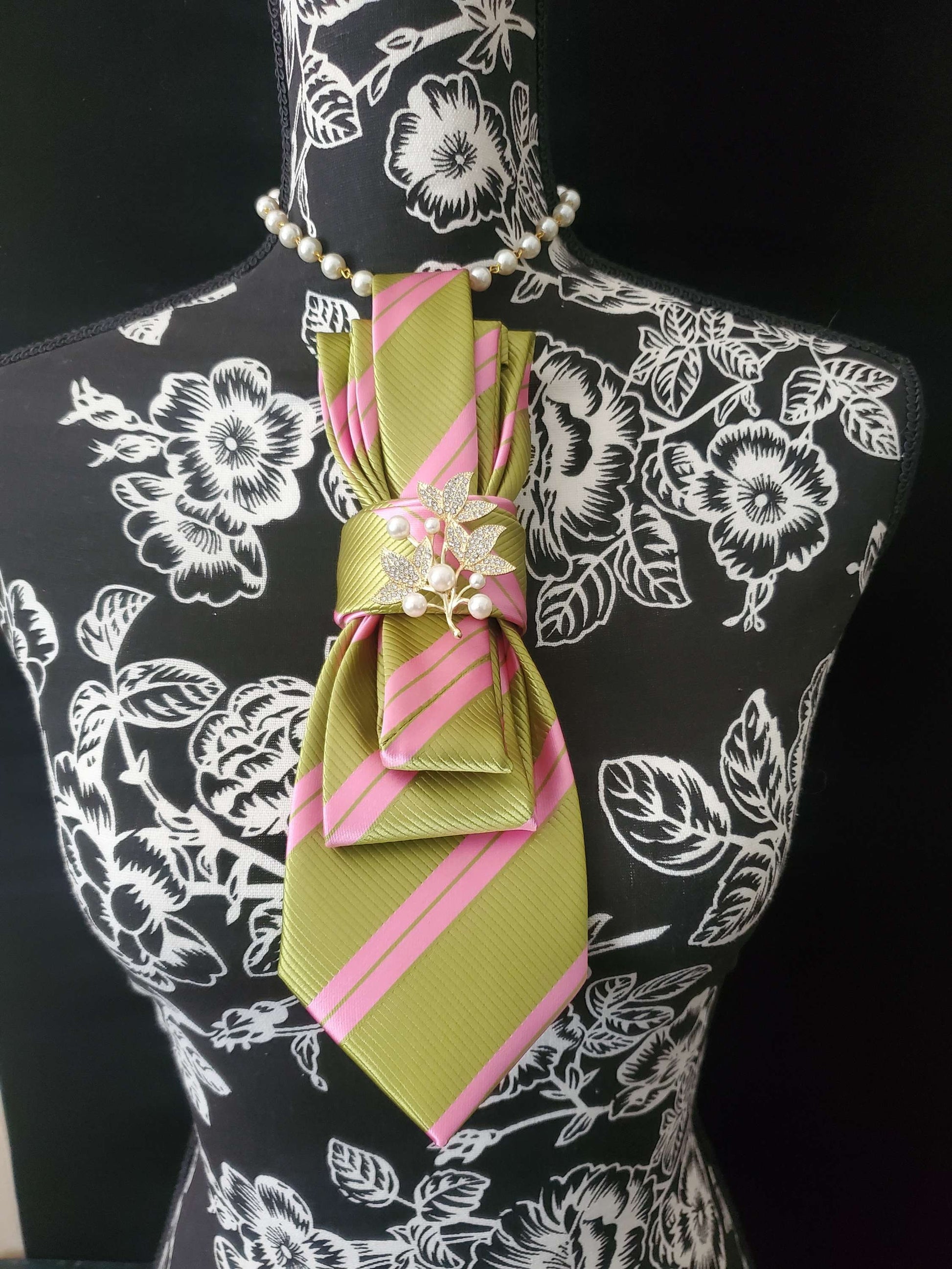 Simply Elegant Pink and Green Stripe Women's Necktie Necklace - Handcrafted Statement Jewelry - Ivy Brooch Necktie For Women