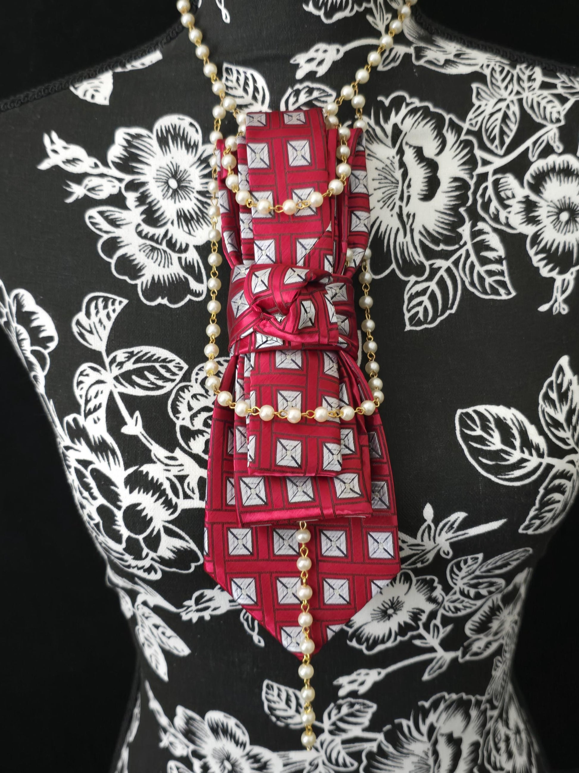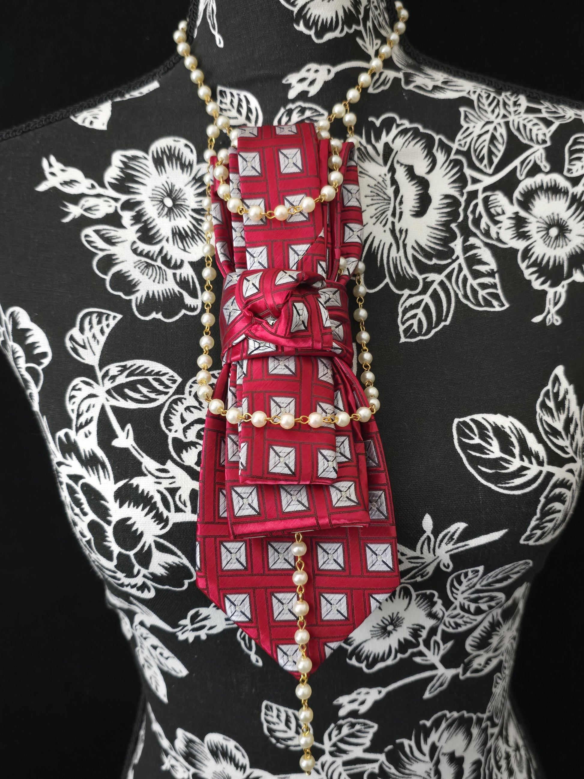 Simply Elegant Red and White Women's Necktie Necklace - Handcrafted Statement Jewelry - Brooch Necktie For Women