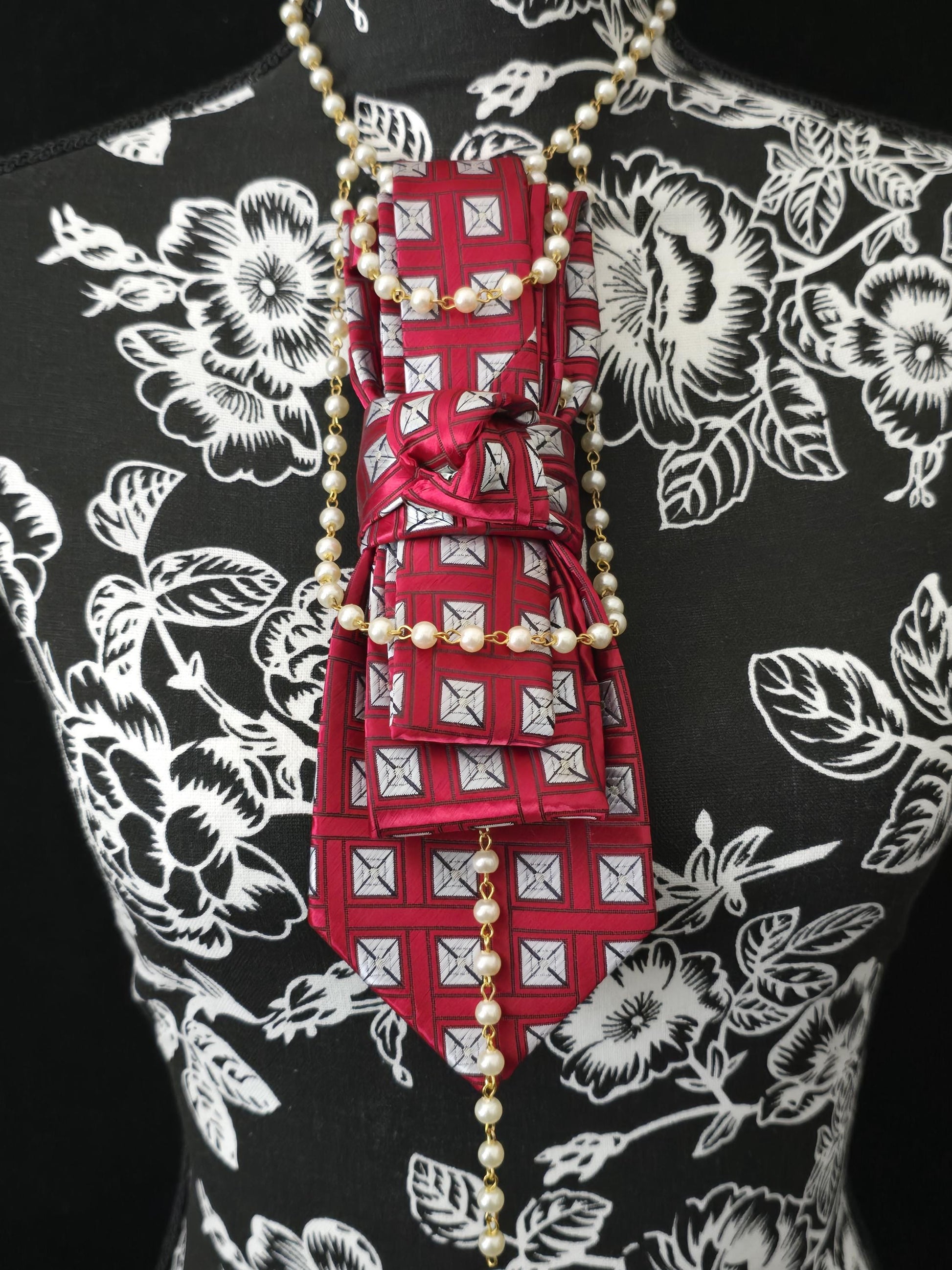 This Red and White Necktie Necklace is made with a (Barry Wang) woven silk tie, and features a Tie Knot Brooch strung on Multi-Strand 6mm adjustable Rosary Chain Ribbon Tie Pearl Necklace . The soft, comfortable fabric sits perfectly on any size chest, while the adjustable necklace feature allows you to customize the fit to your liking. Measuring at a versatile length, this necktie necklace is designed to be a one-size-fits-all.