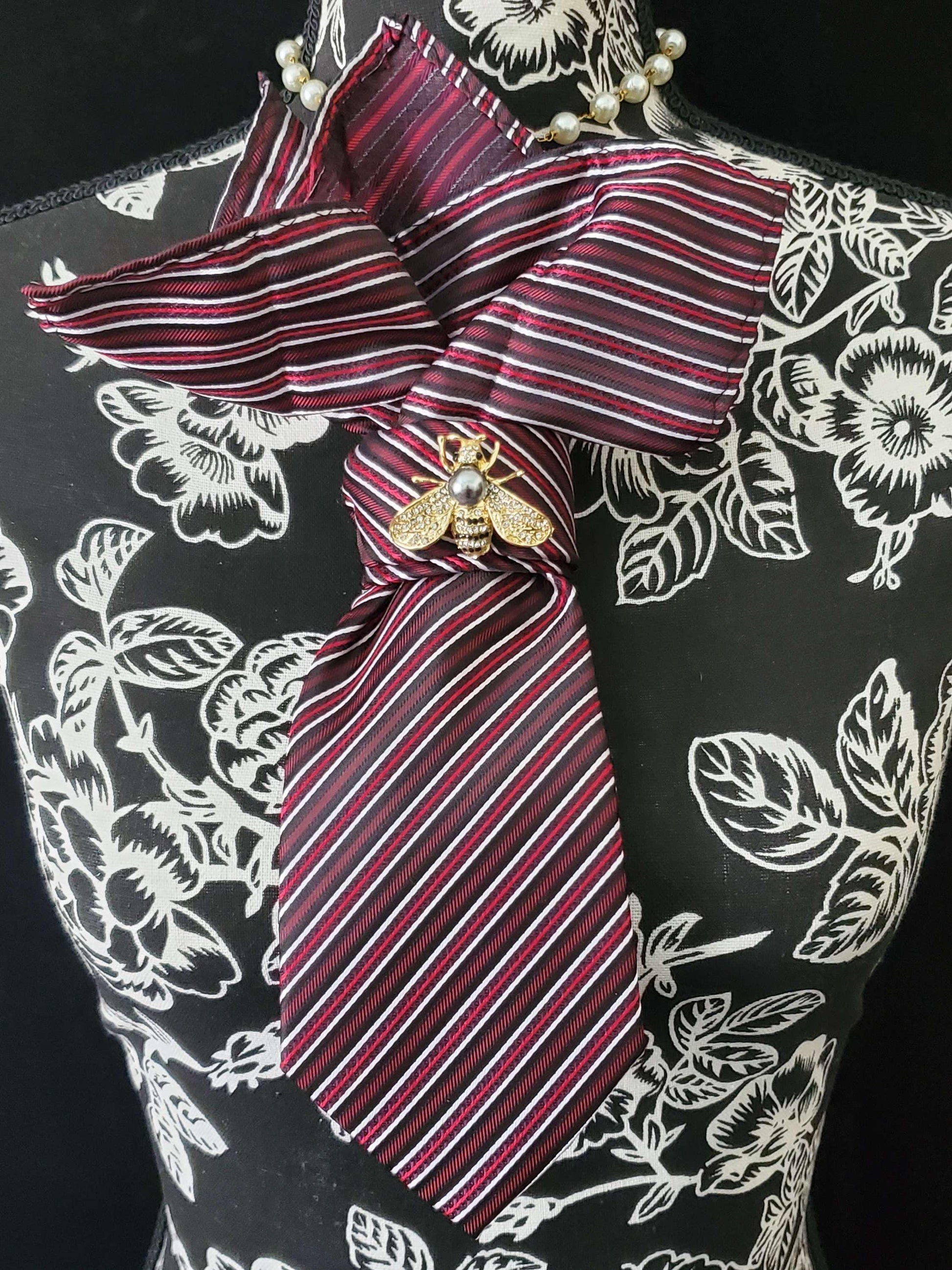 Stylish Black and Red Stripe Women's Necktie Necklace - Bumble Bee Brooch Necklace - Brooch Necktie - Stylish Neckwear For Women