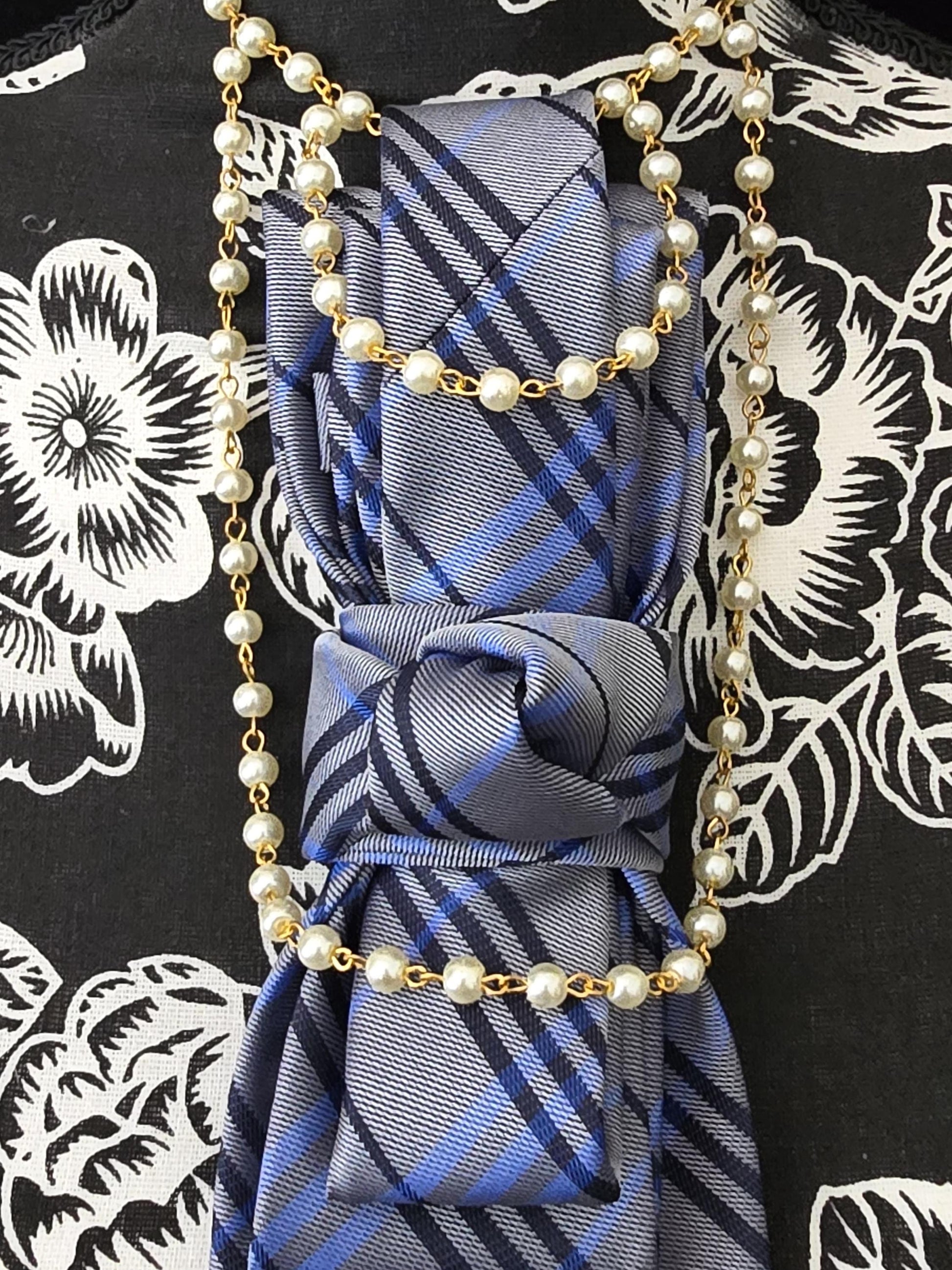 This Blue Plaid Necktie Necklace is made with a (Barry Wang) woven silk tie, and features a Tie Knot Brooch strung on Multi-Strand 6mm adjustable Rosary Chain Ribbon Tie Pearl Necklace . The soft, comfortable fabric sits perfectly on any size chest, while the adjustable necklace feature allows you to customize the fit to your liking. Measuring at a versatile length, this necktie necklace is designed to be a one-size-fits-all.