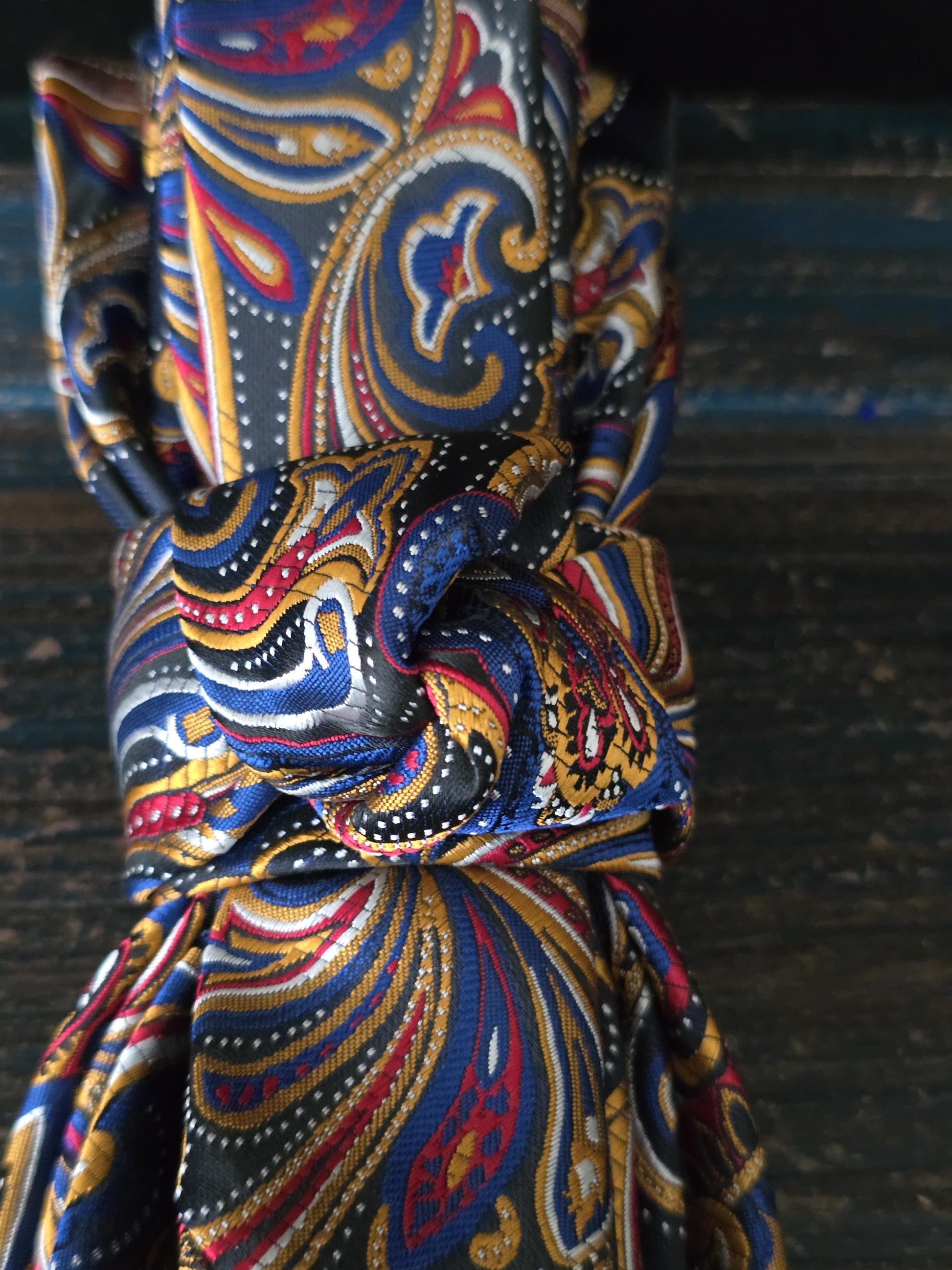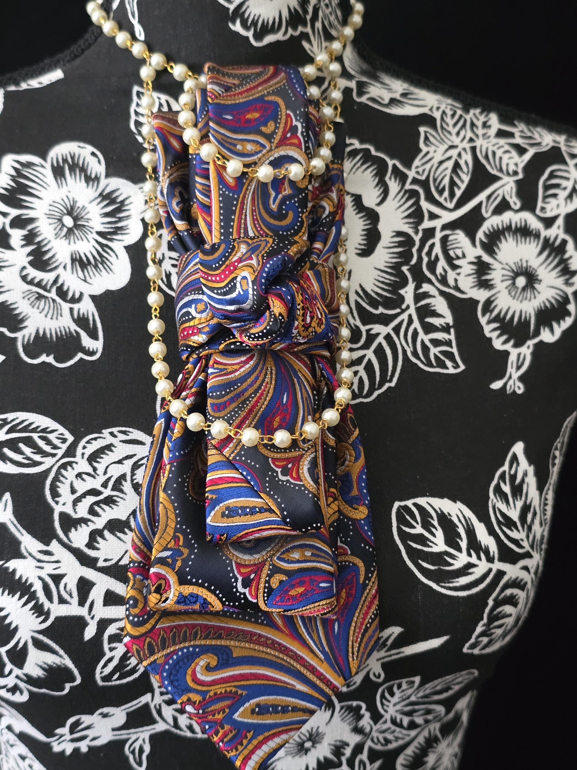 This Red and Blue Necktie Necklace is made with a (Barry Wang) woven silk tie, and features a Tie Knot Brooch strung on Multi-Strand 6mm adjustable Rosary Chain Ribbon Tie Pearl Necklace . The soft, comfortable fabric sits perfectly on any size chest, while the adjustable necklace feature allows you to customize the fit to your liking. Measuring at a versatile length, this necktie necklace is designed to be a one-size-fits-all.