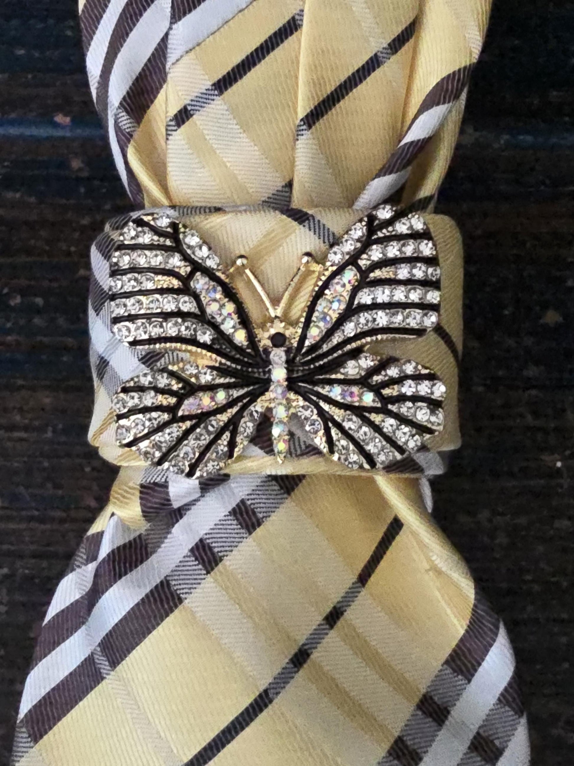 This Yellow and Black Plaid Necktie Necklace is made with a (Barry Wang) woven silk tie, and features a Multi-Color Rhinestone Butterfly Brooch strung on your choice of an adjustable Rosary Chain Ribbon Tie Pearl Necklace or an adjustable Elastic Band. The soft, comfortable fabric sits perfectly on any size chest, while the adjustable necklace feature allows you to customize the fit to your liking. Measuring at a versatile length, this necktie necklace is designed to be a one-size-fits-all.